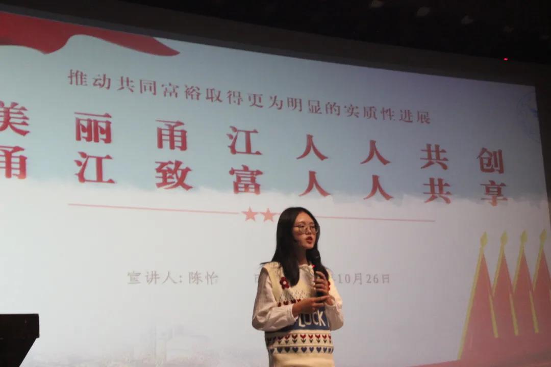 商学院国贸202班徐朵同学带来红色党史类宣讲《聚焦红色甬城 追寻党史记忆》。她从甬城的红色文化、甬城故事、甬城历史三方面带我们一起追忆了甬城的党史记忆。生化学院化工191班陈怡同学带来宣讲《大美甬江人人共建甬江富裕人人共享》。她以家乡广西陆川县和姜山镇甬江村为例,介绍了什么是共同富裕和如何实现共同富裕。她指出青年是共同富裕之路的参与者而非旁观者,我们应当积极投身社会实践,做“有理想、有道德、有文化、有纪律”四有青年。