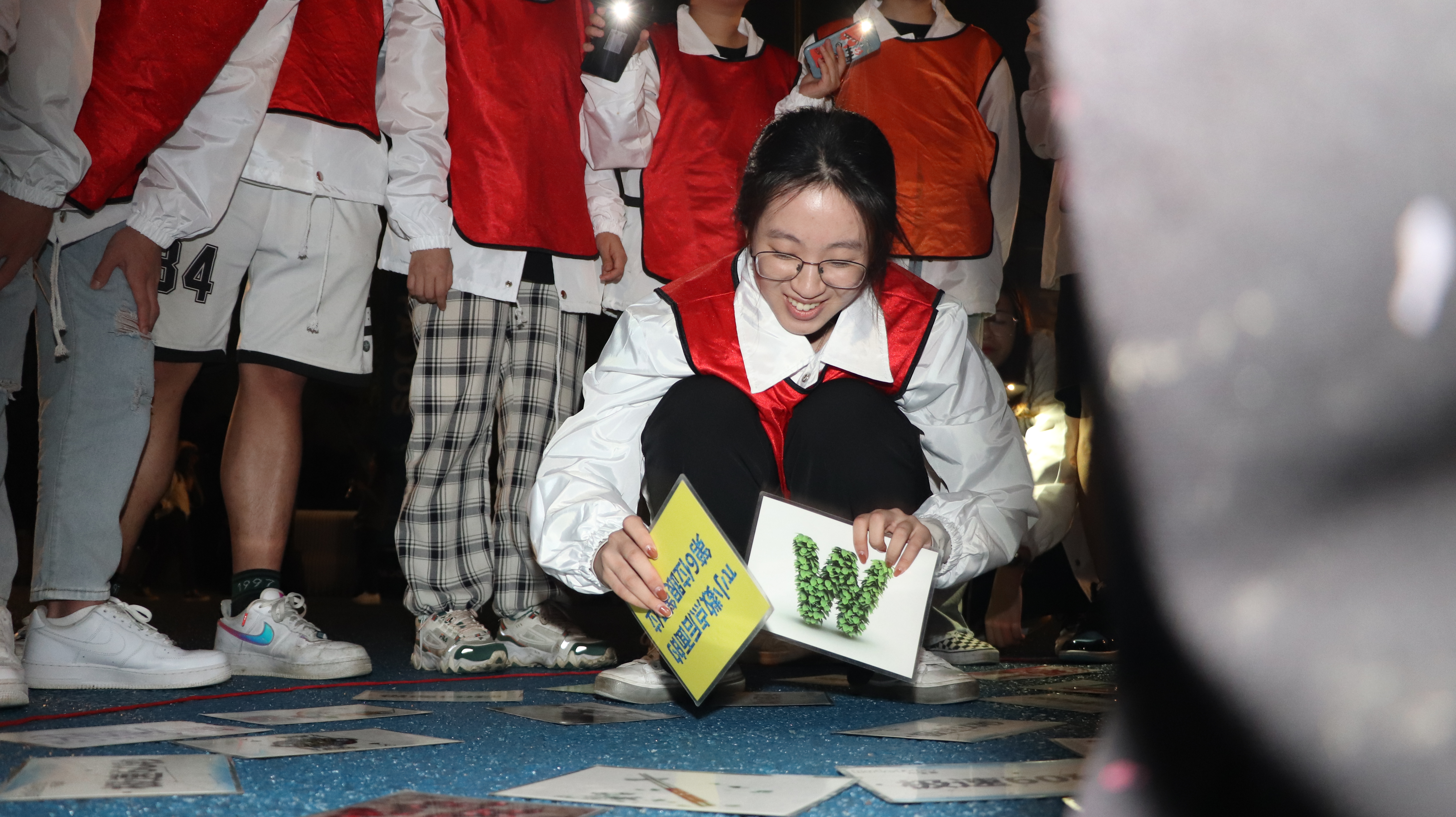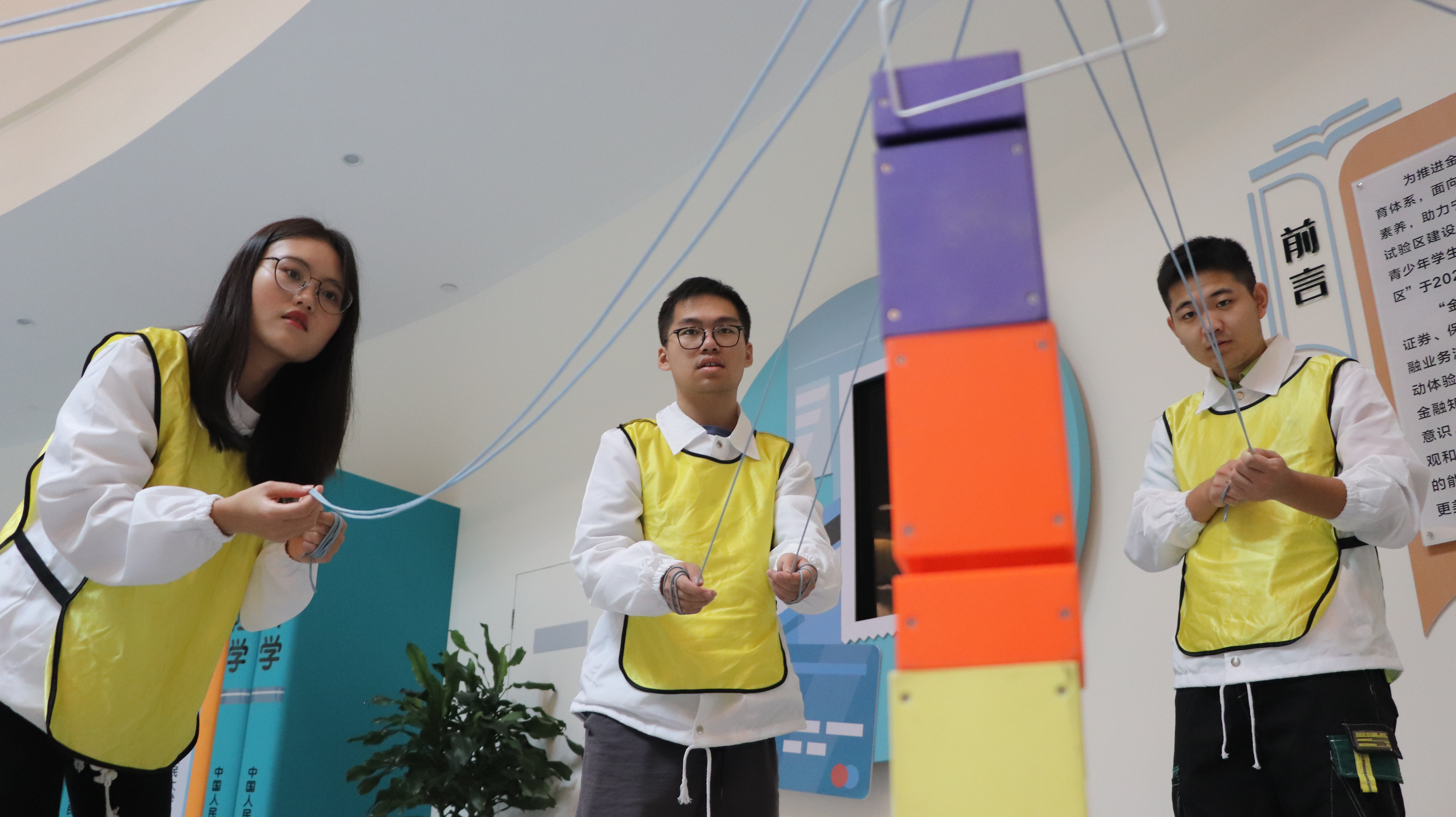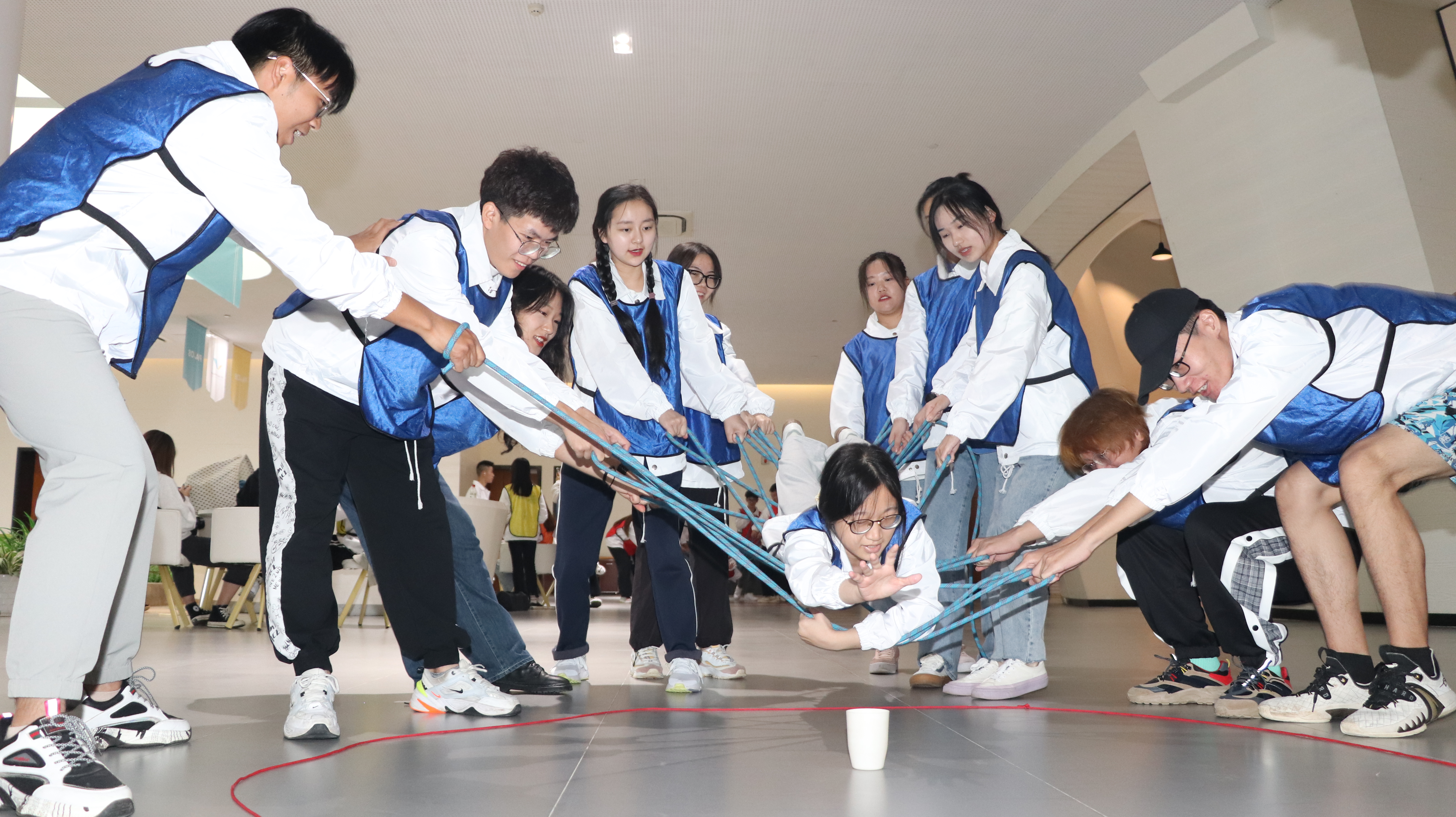 在合力搭建游戏,每个小组组员围成圈,通过拉绳子的方式来控制钩子的移动,将地上散落的积木叠在一起。这个游戏主要锻炼平衡感及团队合作能力,考验团队决策力。最终,黄队以最快的速度完成了任务,其他小组也接连顺利完成任务。