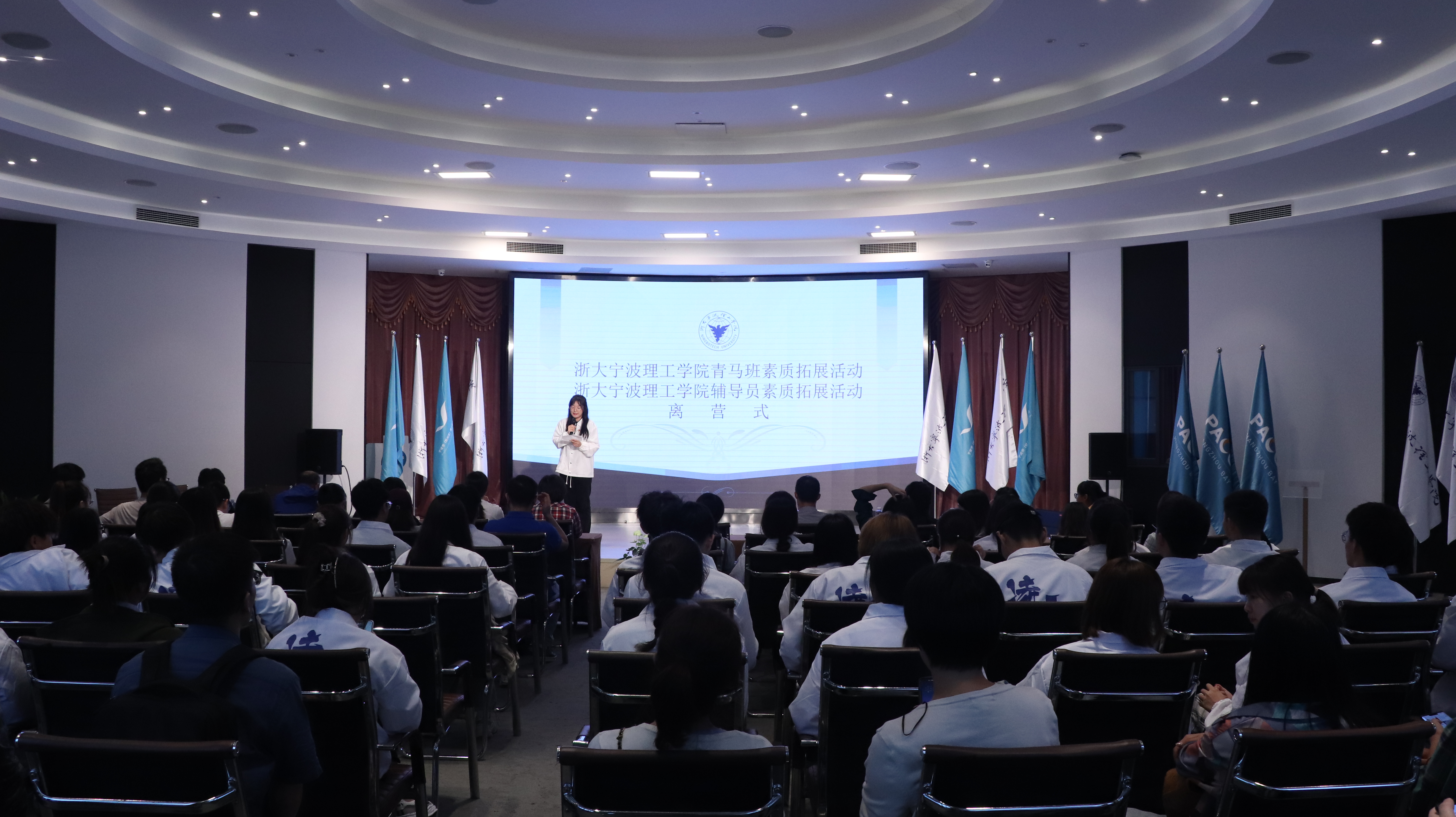 10月16日下午,全体学员们举行离营仪式。同学们通过视频方式一同回顾了这两天的素拓活动,当一张张照片在大屏幕上放映,同学们在脑海里重温当时的场景,品味点点滴滴,同时也审视自身,继续奋进。各小组学员代表总结发言:戴贤泽同学表示青年要有理想信念,将素质拓展中的精神延伸到青年的发展当中;邹嘉元同学表示团结的力量更胜于个人的力量,要注重团队精神,两天的时间是短暂的,但所学习的、所经历的必将是永生难忘的。王涛同学感谢与青马学员们的相遇,并表述对未来的课程与学习充满期待。