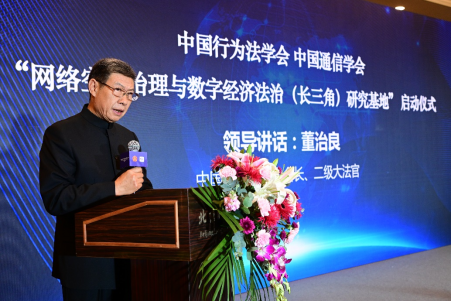 中国行为法学会会长董治良在致辞中指出,“网络空间治理”和“数字经济法治”已是世界范围内的热门关键词之一。近年来,我国在网络安全、数据安全领域立法取得了重大进展,尤其是网络安全法、数据安全法、个人信息保护法的颁布施行,标志着我国网络安全和数据保护的基础性法律架构已经建立。相关的落实和细化基础性法律的行政法规、地方性法规和政府规章还在制定过程中。可以说,我国数据安全保障能力在不断提升,数据开发利用和产业发展得到法律的支持和保障,我国数据潜力即将得以极大释放,产出巨量的经济成果。在这样的大背景下,我们启动成立“网络空间治理与数字经济法治(长三角)研究基地”,以加强网络治理与数字法治理论和实践问题研究,可谓恰逢其时,意义重大。希望研究基地围绕党中央决策部署和国家战略规划,准确对标新时代的新要求,聚合国内外优势科研力量,加强数字治理、数据确权、数据共享、数据开放、数字政府等领域的理论研究,撰写高层次专题报告,努力形成一批有辨识度、有影响力又实效管用的数字法治研究成果,把研究基地办成覆盖长三角地区、服务全国的网络治理与数字经济法治高端专业智库。
