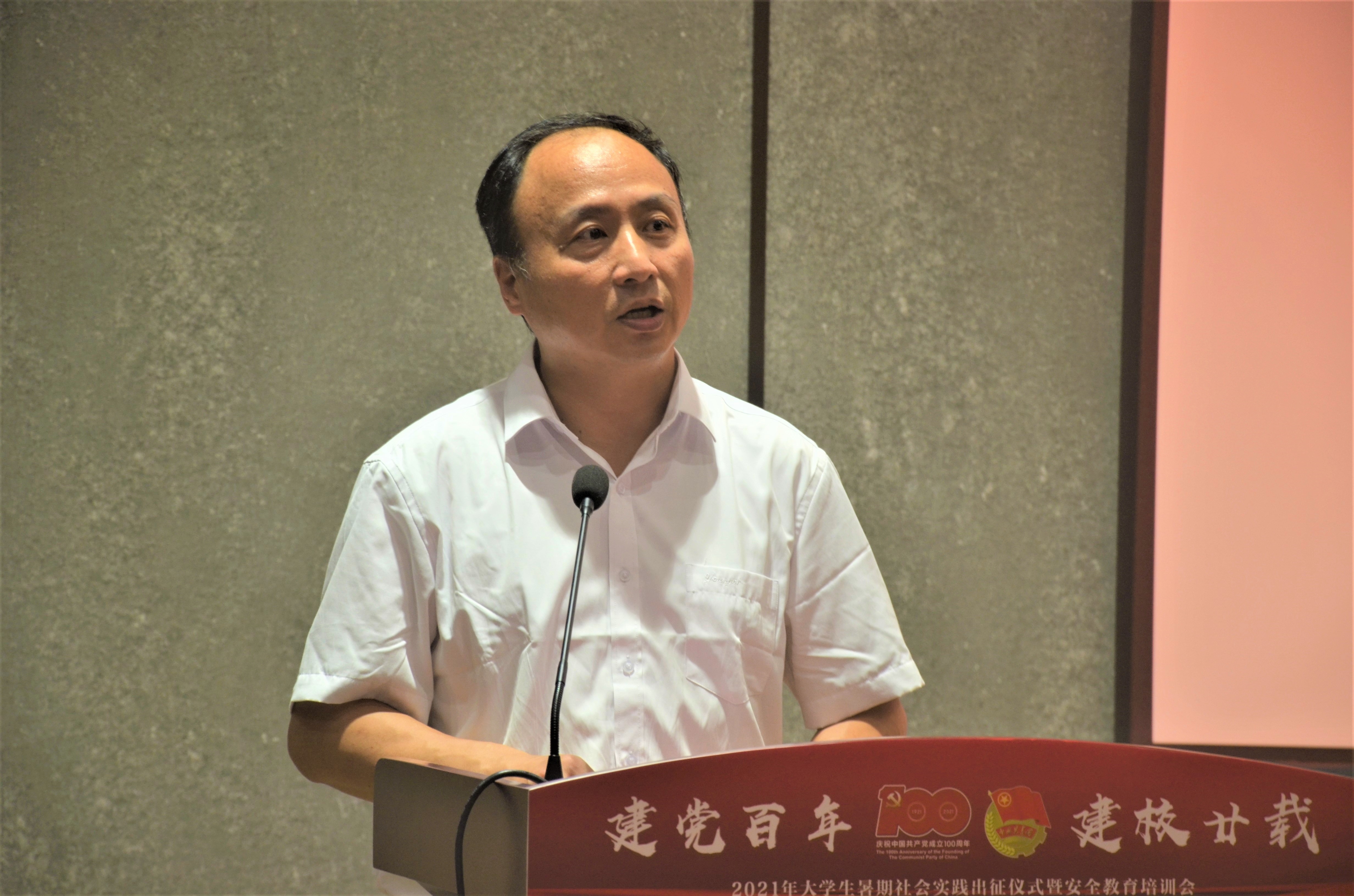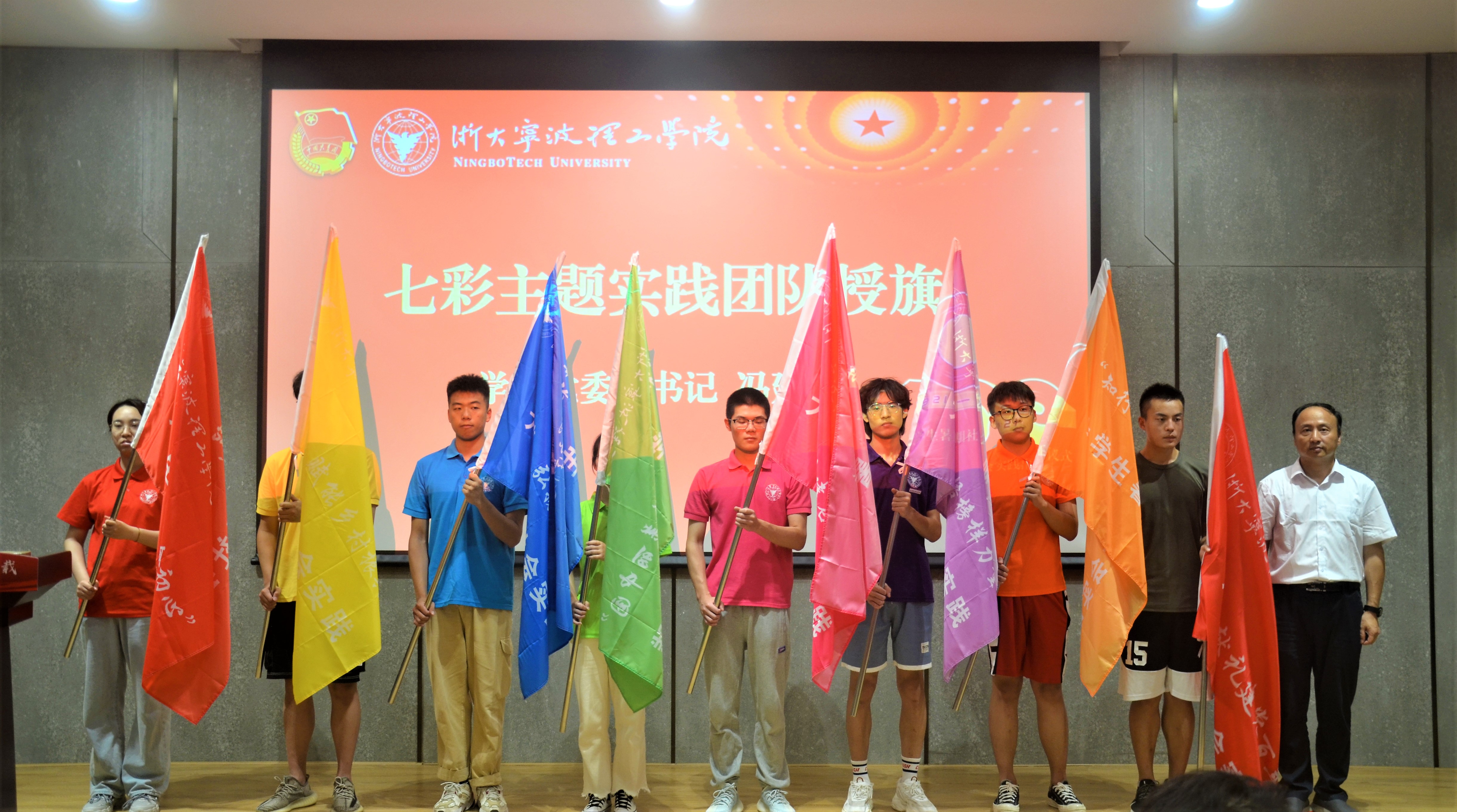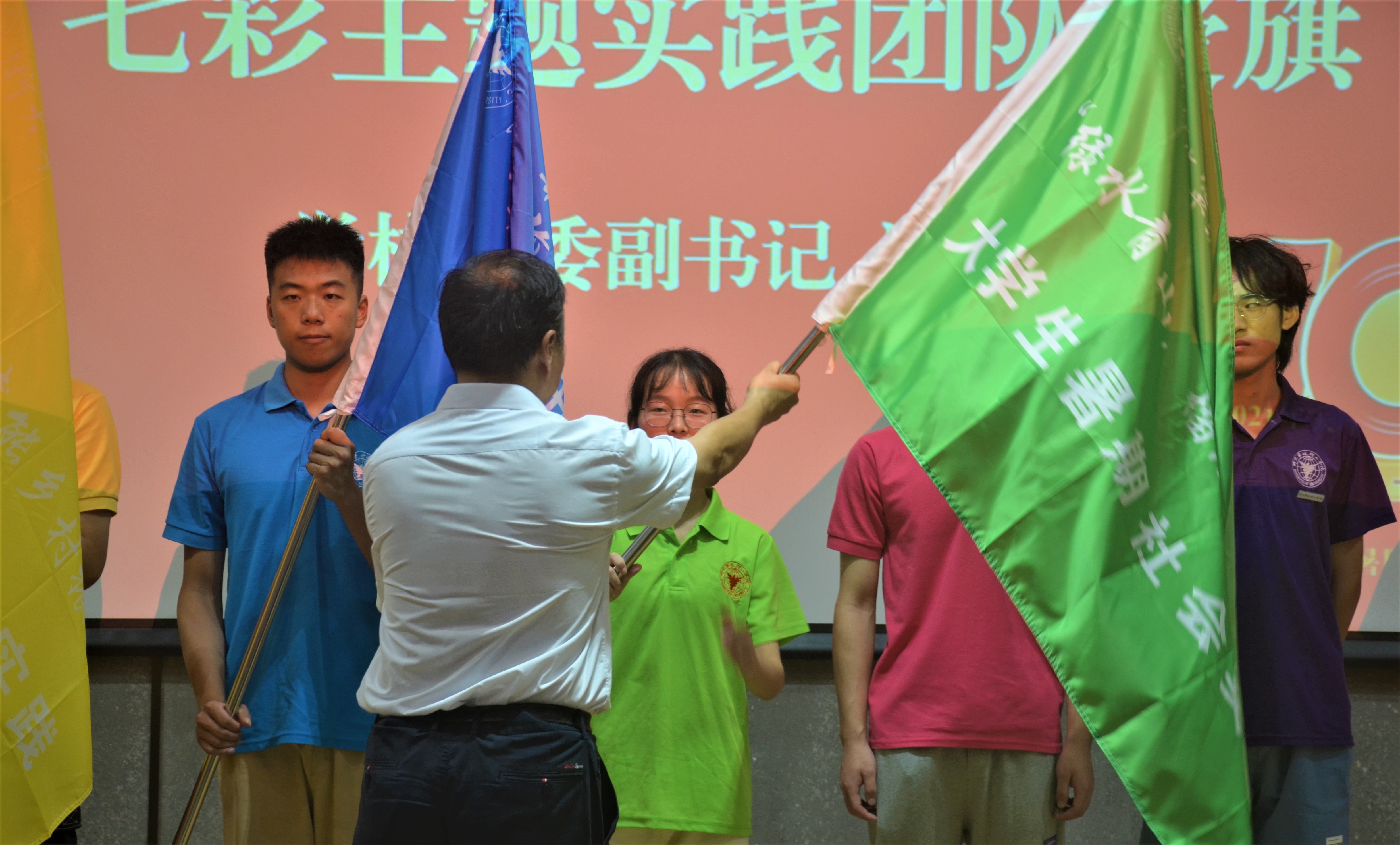 学校党委副书记冯建波做动员讲话,并为七彩主题团队代表授旗。他指出,社会实践是学生“第二课堂”和实践育人的重要阵地。每年暑期,浙大宁理学子都积极投身于社会实践活动,在实践中认识社会、了解国情、增长才干、锻炼成长。去年,在疫情大背景下,全体师生仍然克服困难、创新方式、服务社会,荣获了“全国优秀团队”1项、浙江省“百强团队”4项、浙江省“优秀团队”3项的佳绩。今年,在建党百年、建校廿载之际,开展好暑期社会实践活动,是推进党史学习入脑、入心的重要载体,引导广大青年做有志气、有骨气、有底气中国人的重要途径。他希望青年学子们:一是把庆祝建党100周年、建校20周年、党史学习宣传教育与社会实践结合起来,在担当使命中强化政治信仰,坚定理想信念;二是勇于担当奉献,彰显青春本色,在社会实践中增长本领才干,做到知行合一;三是要学会“自找苦吃”,深入基层调研实践,把论文写在中国大地上,在苦干实干中锤炼意志品格,永远艰苦奋斗。