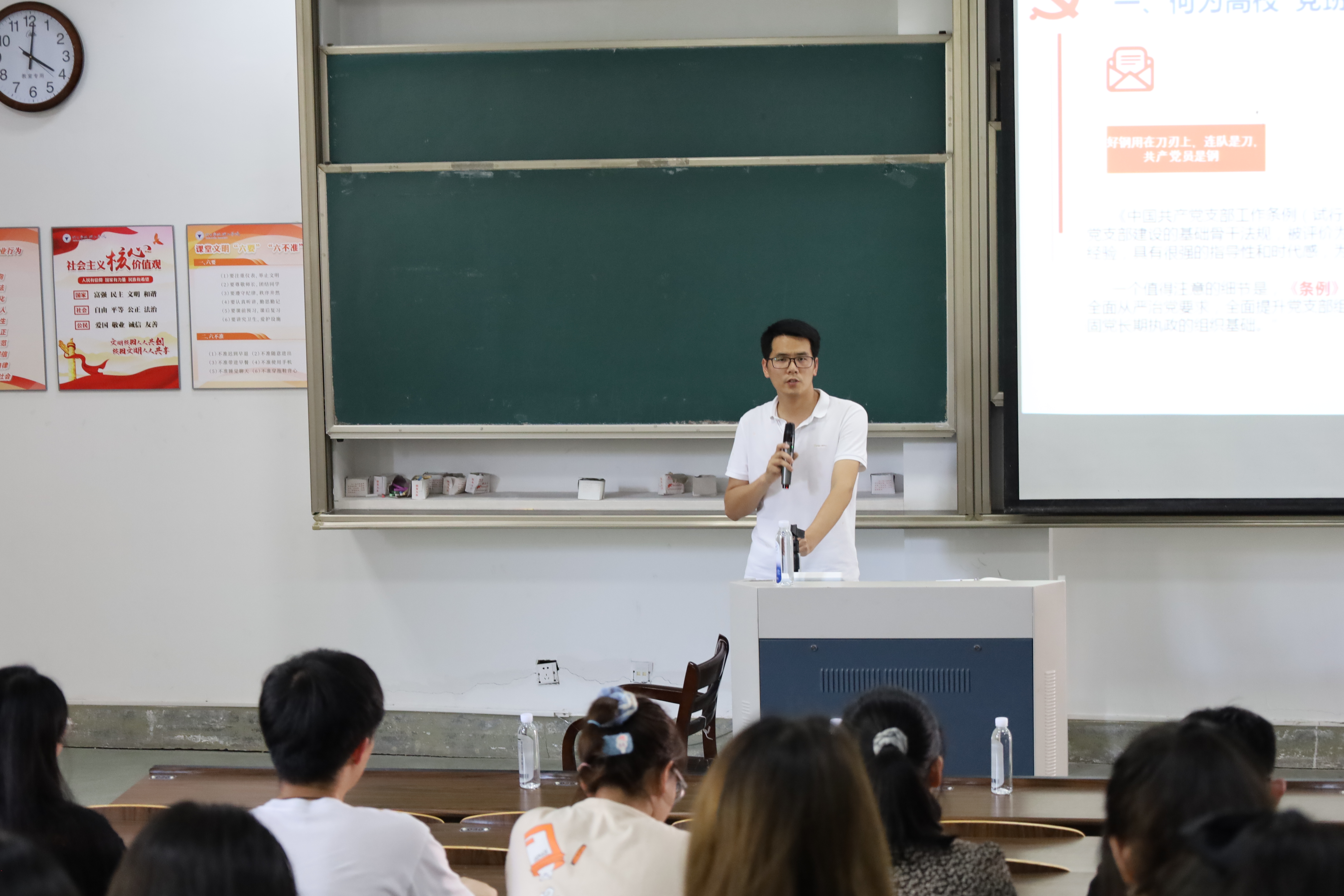 5月14日,“党班团一体化建设模式探讨”理论学习第二讲在SF106举行。组织部宋汉文带领大家重温入党流程及要求,并从“党建工作应与专业、班级结合”两个方面分享有关经验,以此调动全体师生的入党积极性。