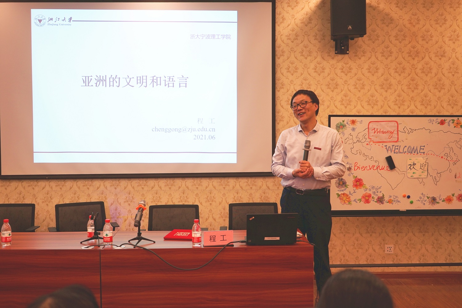 仪式结束后,程工教授以“语言学与亚洲文明”为主题作学术讲座。他的发言围绕亚洲文明起源、亚洲文明和语系、亚洲文明与语言接触以及亚洲文明与文字谱系这几个议题展开。程工教授将亚洲语言和文字纳入文明的视角下考察,重点探讨了语言和文字在亚洲文明的形成、交流与互鉴中的作用。语系、语言接触和语种文字的研究可以为考察亚洲各文明的兴起以及亚洲各民族的形成、扩散和迁徙提供较为丰富可靠的证据,并可与考古和系统基因学的证据相互印证。讲座最后,他提出了亚洲文明的基本特质是“多元共生,生生不息”以及翻译和文化交流互鉴在促进亚洲文明中的突出作用。