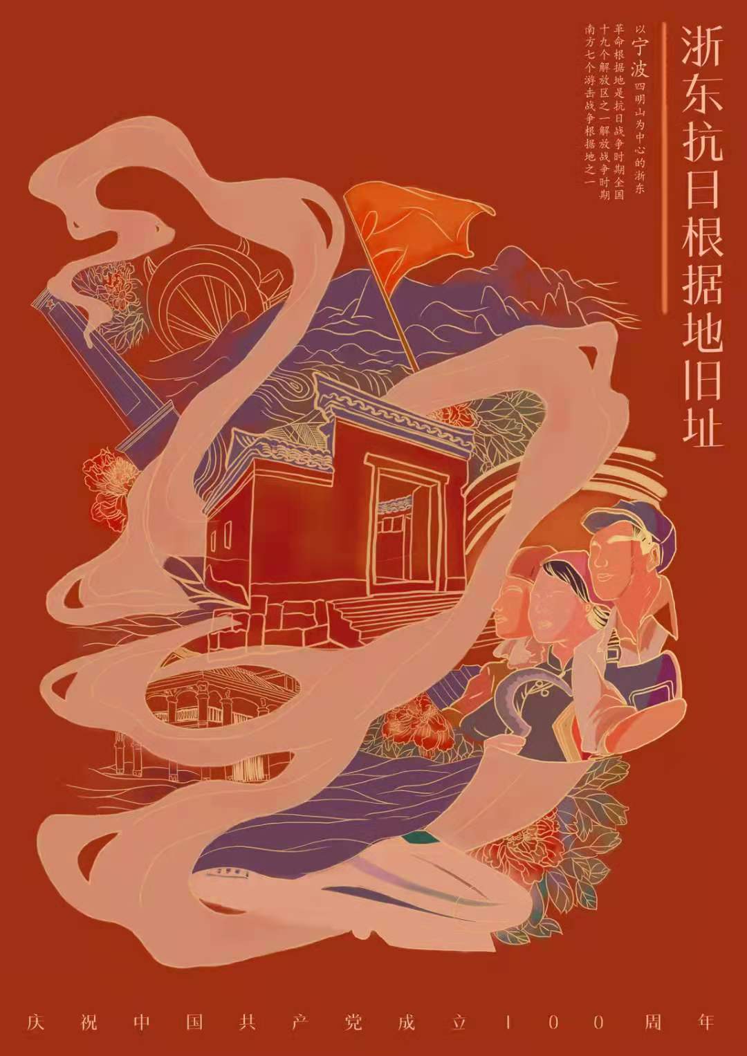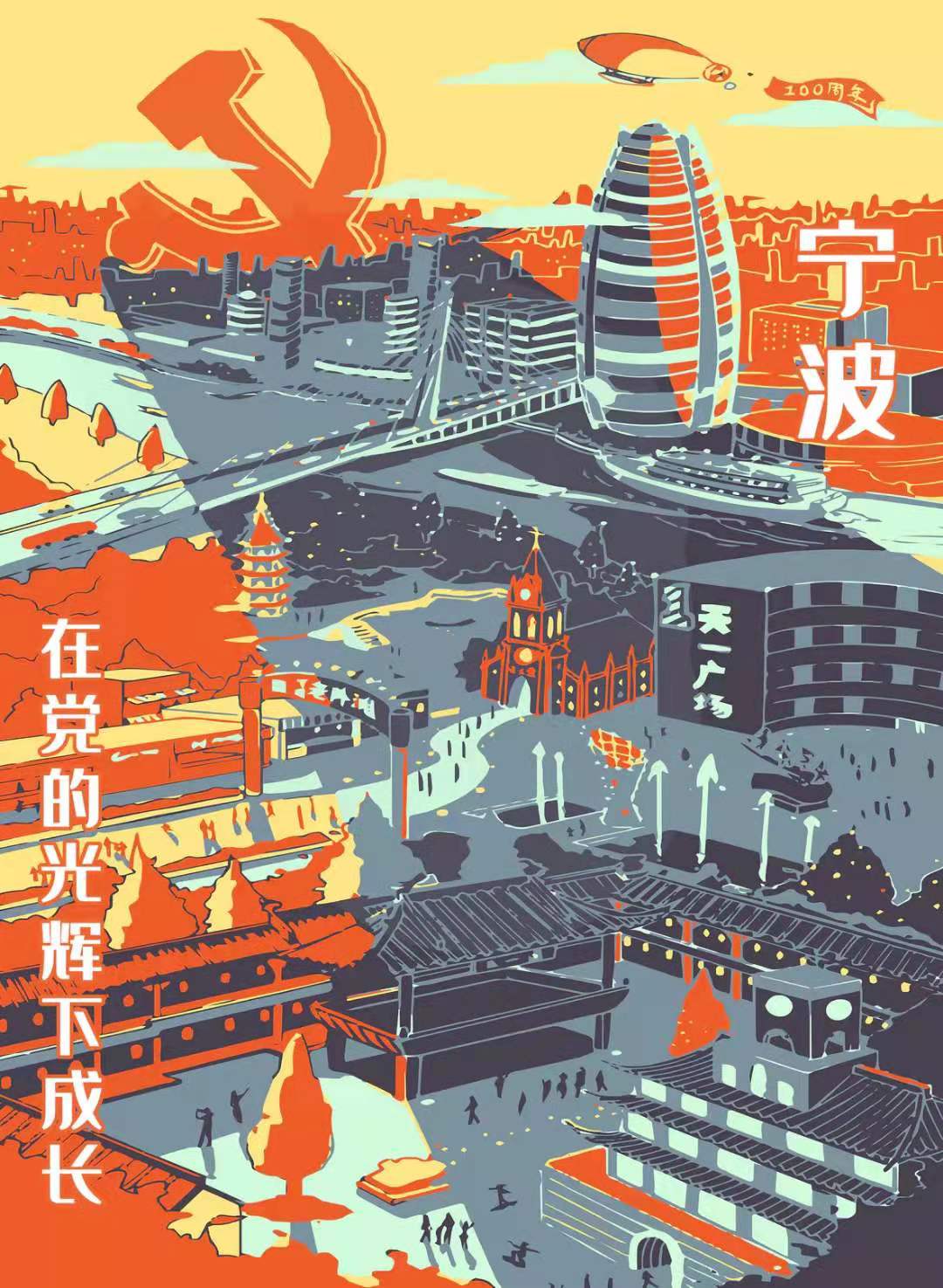 这些出自工业设计与数字媒体艺术专业的120多名学生之手,在专业任课教师、思政理论课教师和辅导员共同指导下,同学们通过查阅历史资料,梳理了党史中的重要人物、党史中的红色地标、宁波红色遗址等几部分内容,运用图形创意的视觉表达技法,结合东方色系,探索当代人喜爱的视觉表达形式,达到“又红又潮”的设计目标。