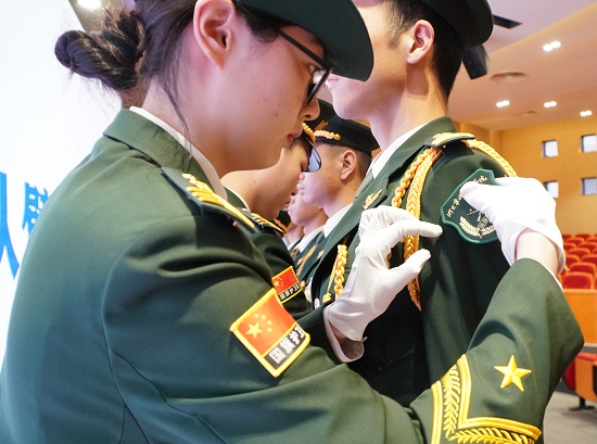 活动现场,学校国旗护卫队第十五届老队员为第十六届新队员佩戴上自己的臂章,这枚臂章见证了老队员的奋斗经历,也传承着国旗护卫队“团结护旗,矢志报国”的精神。新队员在五星红旗下庄严许下“一日入队,一生护旗”的青春誓言。