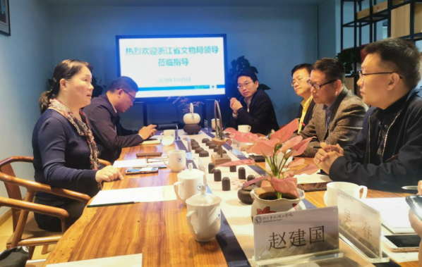 2020年11月5日下午,浙江省文物局副局长曹鸿、博物馆与社会文物处处长杨文庆来校调研指导工作。学校副校长鲁东明,数据学院、设计学院、传媒学院相关党政领导陪同调研。