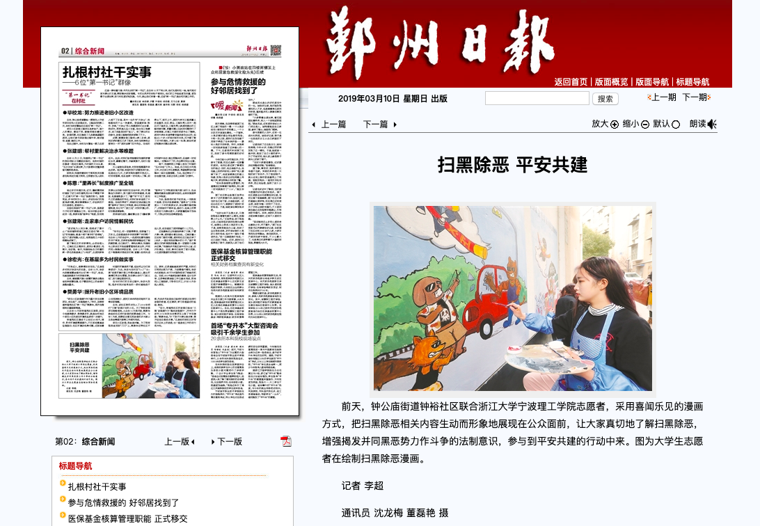 “甬上韶时光——基层社区文化氛围提升项目”以“挖掘内在文化,塑造特色之美”为宗旨,通过发挥师生志愿者们的专业技能和个人所长为社区提供两方面服务,对内主要是设计社区IP形象、制作原创公益海报、美化和改造社区“四面”等;对外则是围绕社区文化宣传,开展田野调查并以新媒体作品形式实现输出、打造文化公益展览等。项目已开展2年,2019年参与活动人数超过272人,服务时长达1187小时,已推进繁裕社区、黄鹂社区等地的文化氛围提升,发挥了对居民的引领作用,多次受到浙江团省委微博、钱江晚报客户端、宁波晚报等媒体的报道关注。