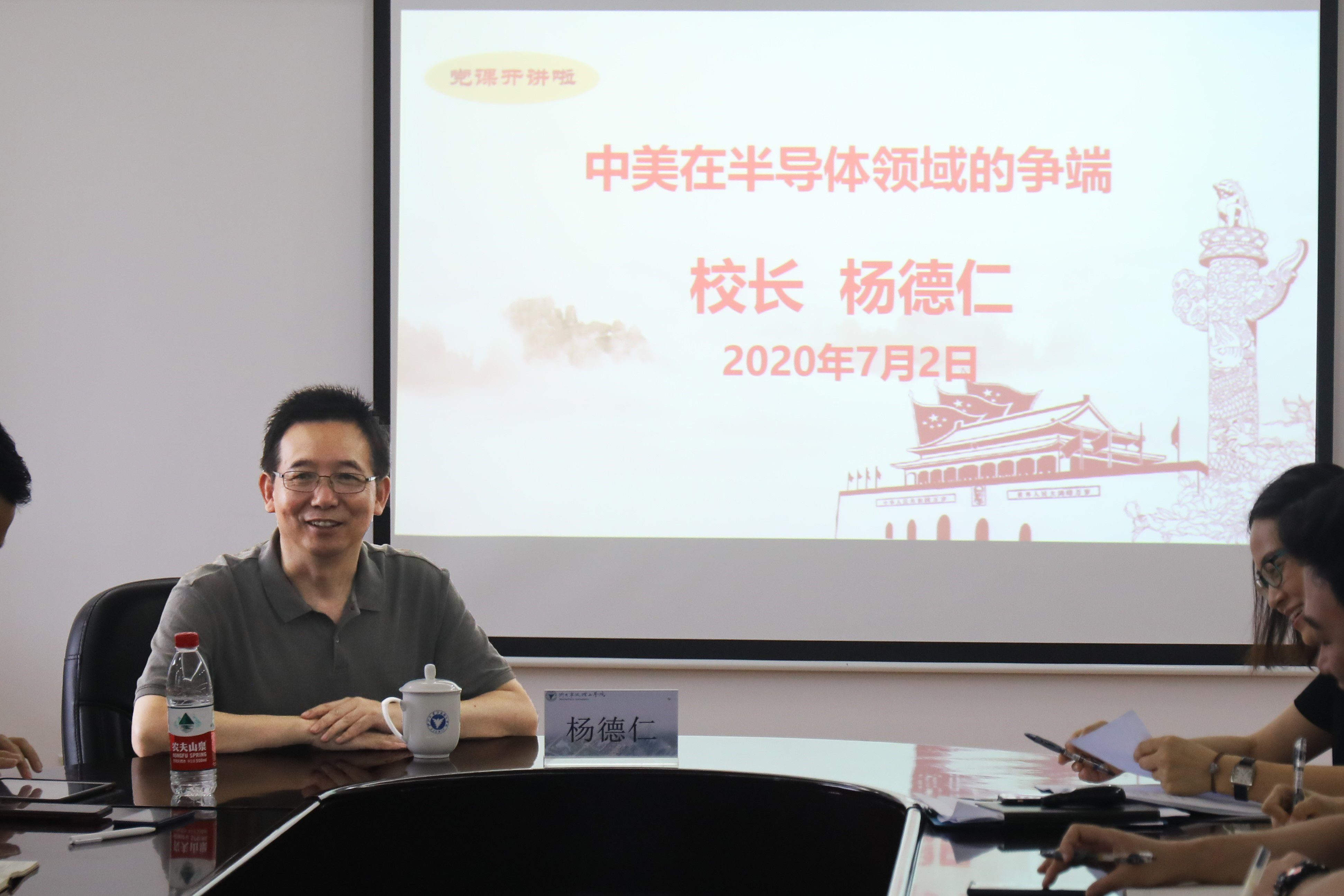 为激发教师党员和管理干部的使命感、责任感,在宁波努力当好浙江“重要窗口”模范生和学校建设全国百强高校的新征程上贡献力量、展现担当,7月2日下午,学校校长、党委副书记杨德仁到所属机关党委第一支部作题为《中美在半导体领域的争端》专题党课。党支部书记刘群娣主持党课,支部全体党员聆听党课,党课吸引了机关其他支部党员教师参加。