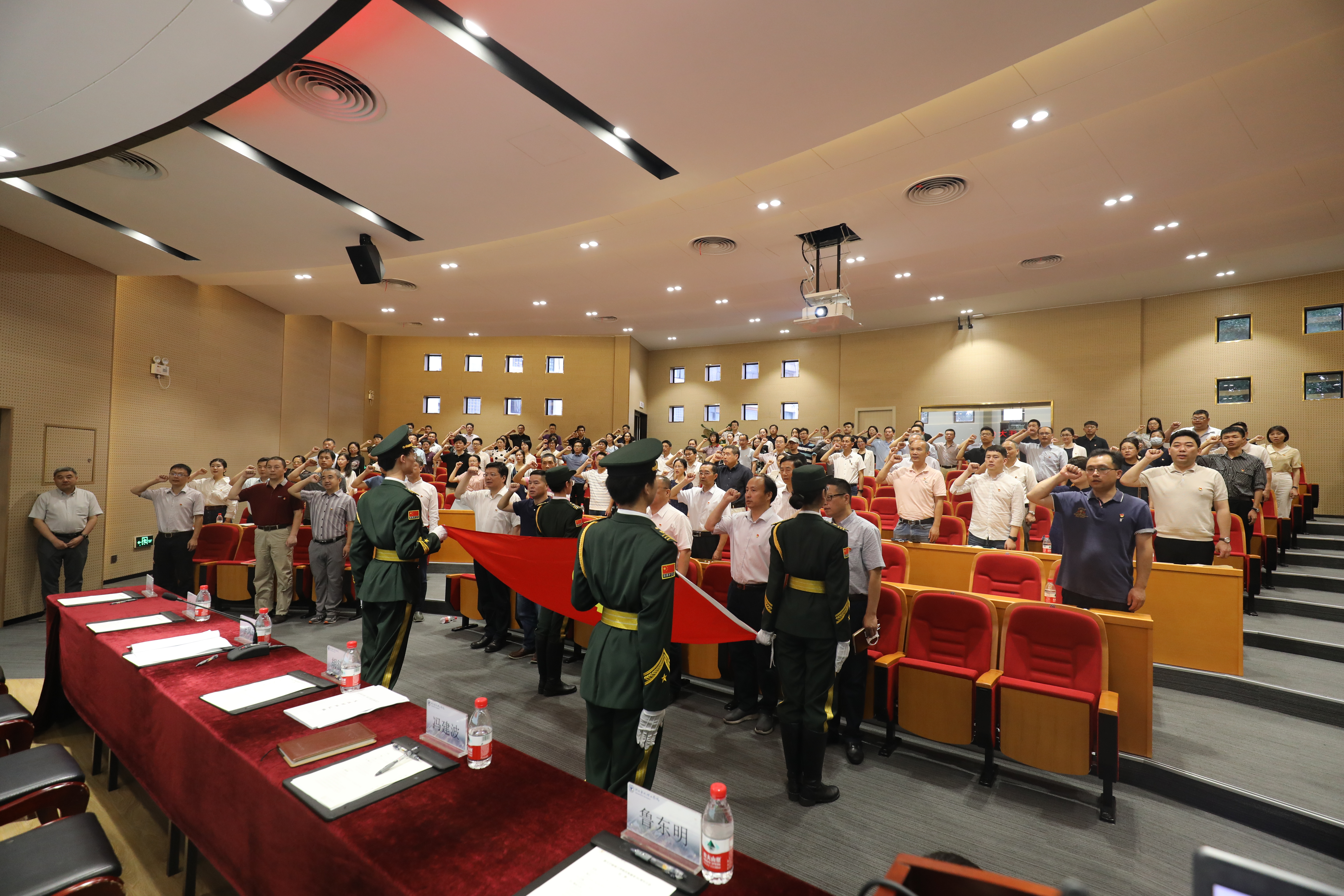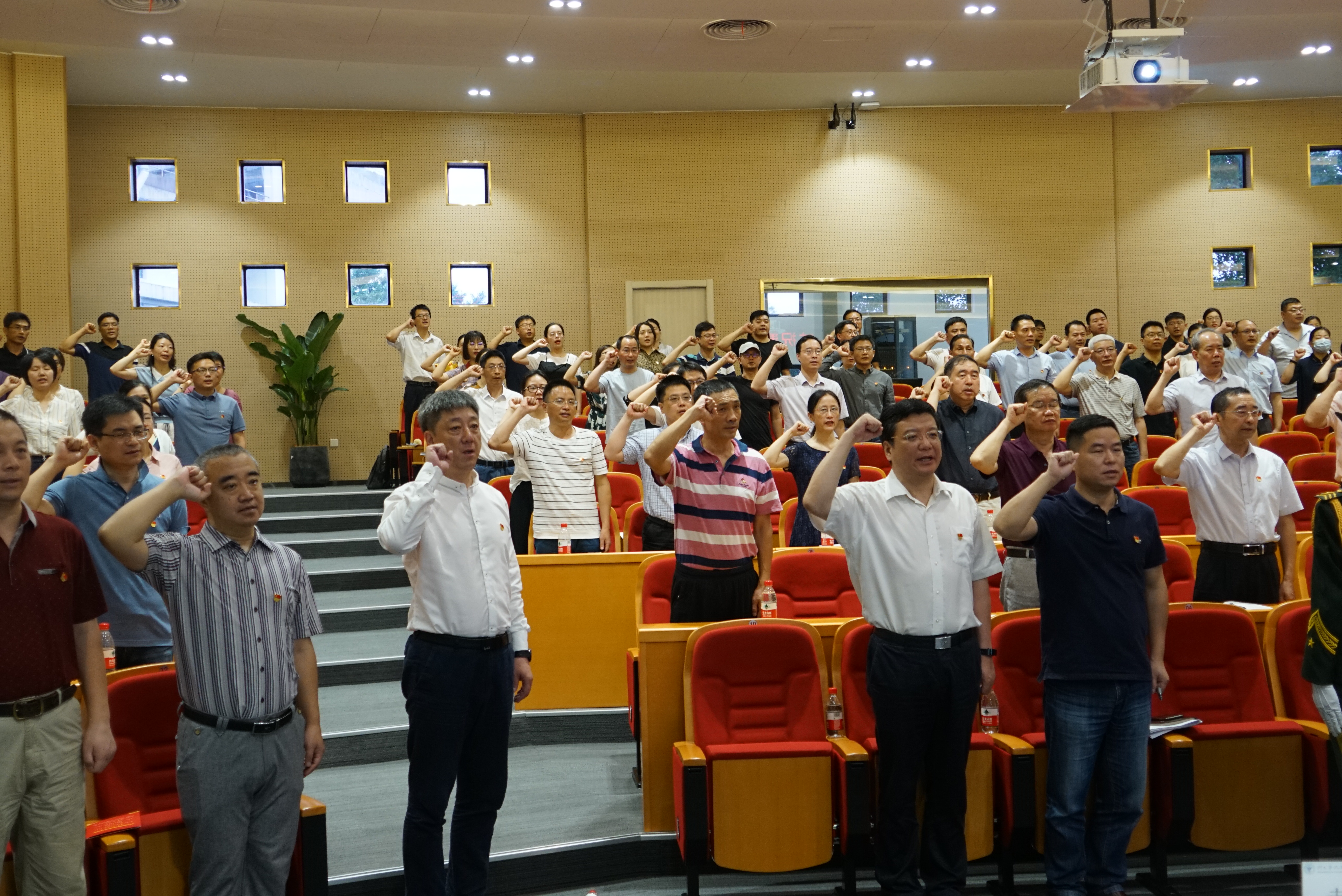 大会现场,党委书记胡征宇主持并领誓新党员代表入党宣誓,在场老党员一起重温入党誓词,提醒每名党员不忘初心、牢记使命,把党员义务牢记在心,永葆本色,用实干彰显共产党人的人格力量和政治本色。
