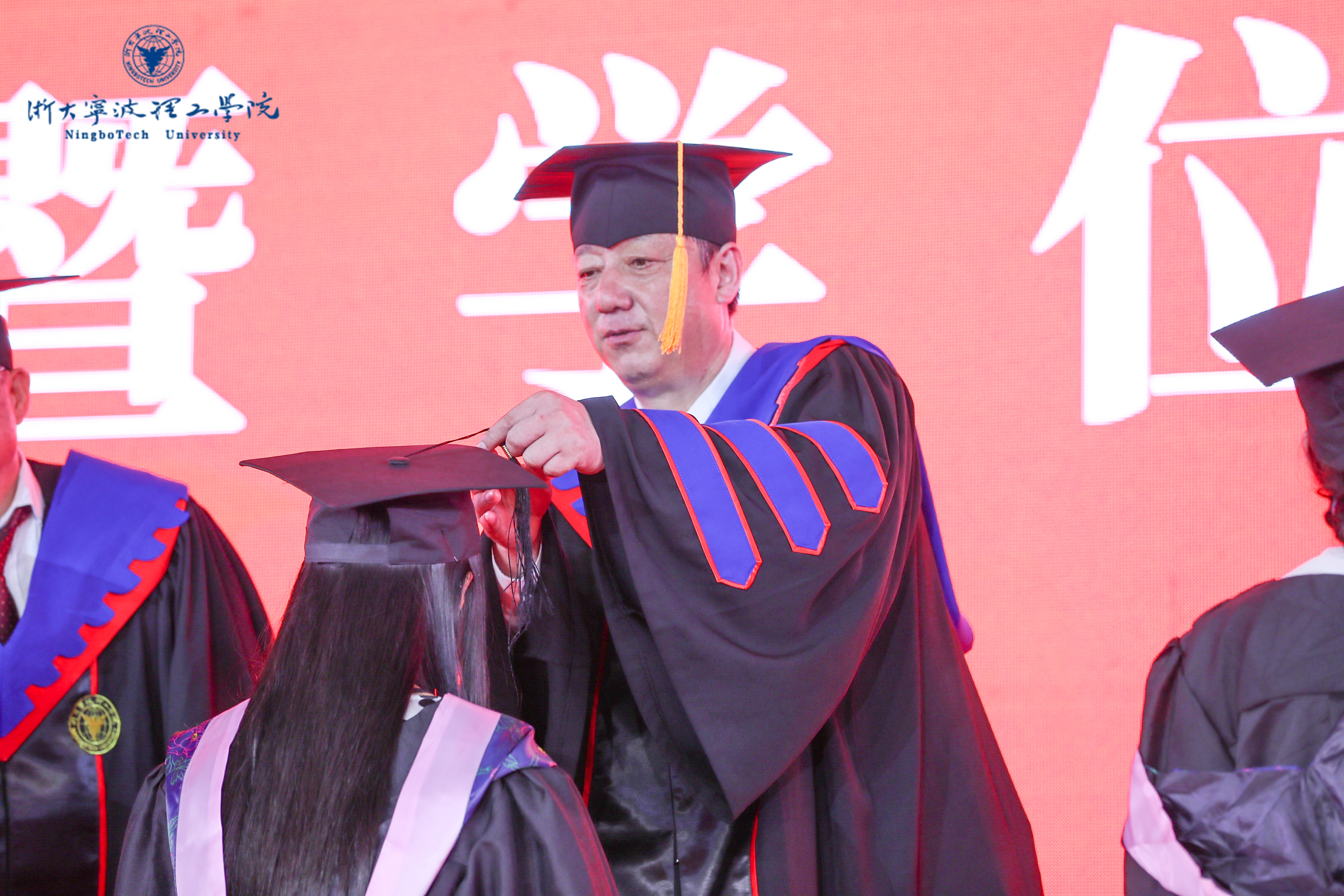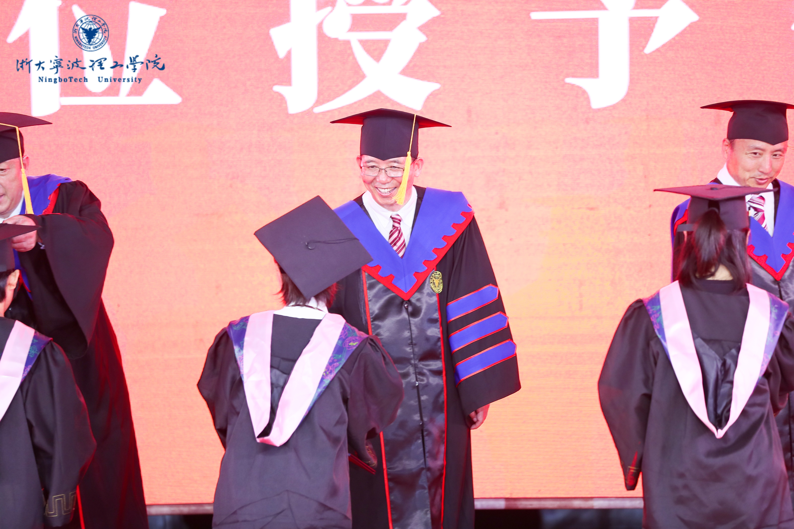 学位授予仪式现场,杨德仁手持学术权杖,与导师们一同步入会场;由旭声教授、舒振宇教授、各学院院长和学校领导一同为毕业生颁授学位证书,教师代表向毕业生逐一送上祝福;毕业生依序上台接受学士学位,向师长的教诲致礼答谢;学士帽上的流苏从右向左拨动,是难忘的青春记忆,是珍贵的成长印记,也是收获的人生财富。