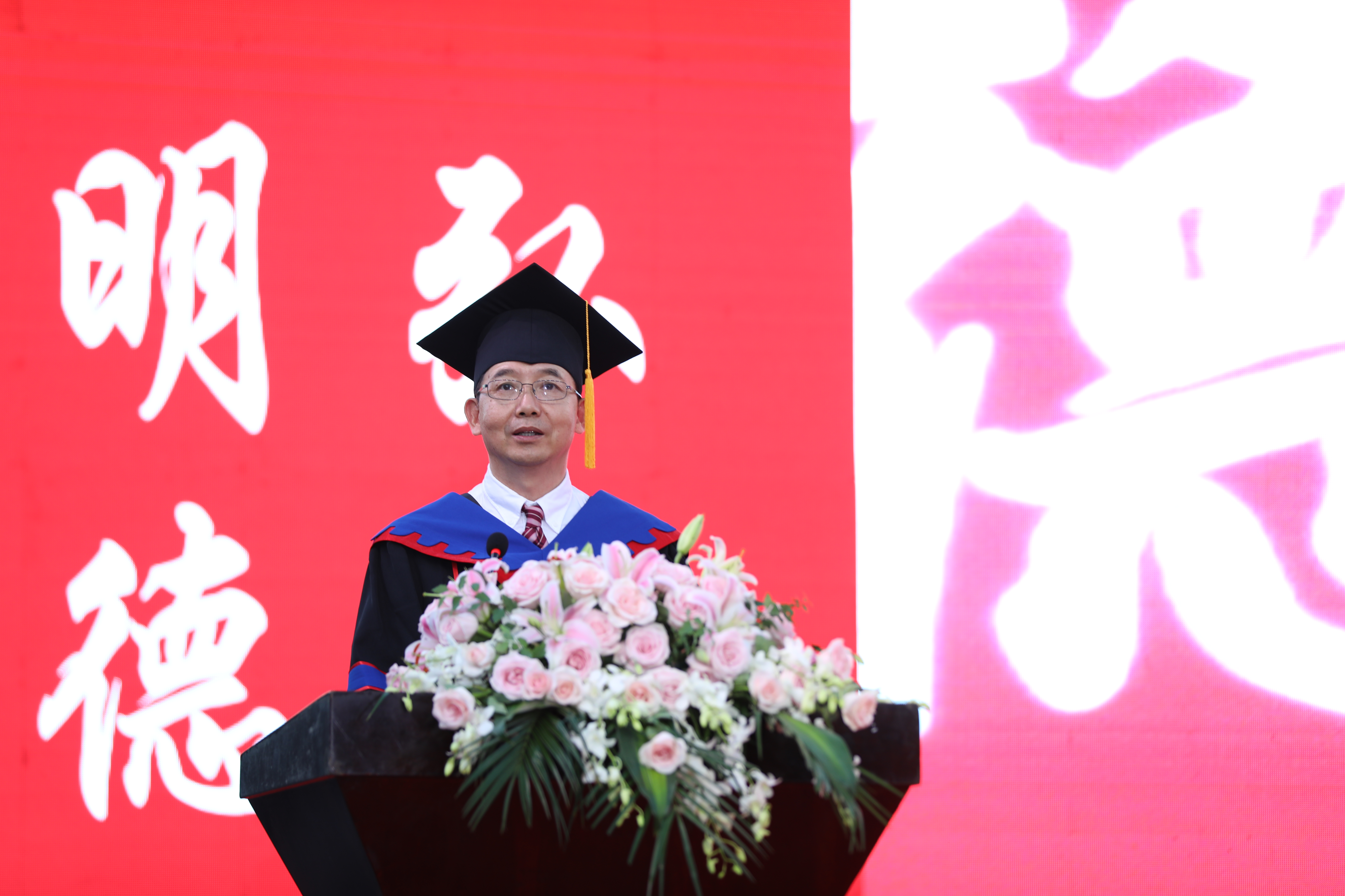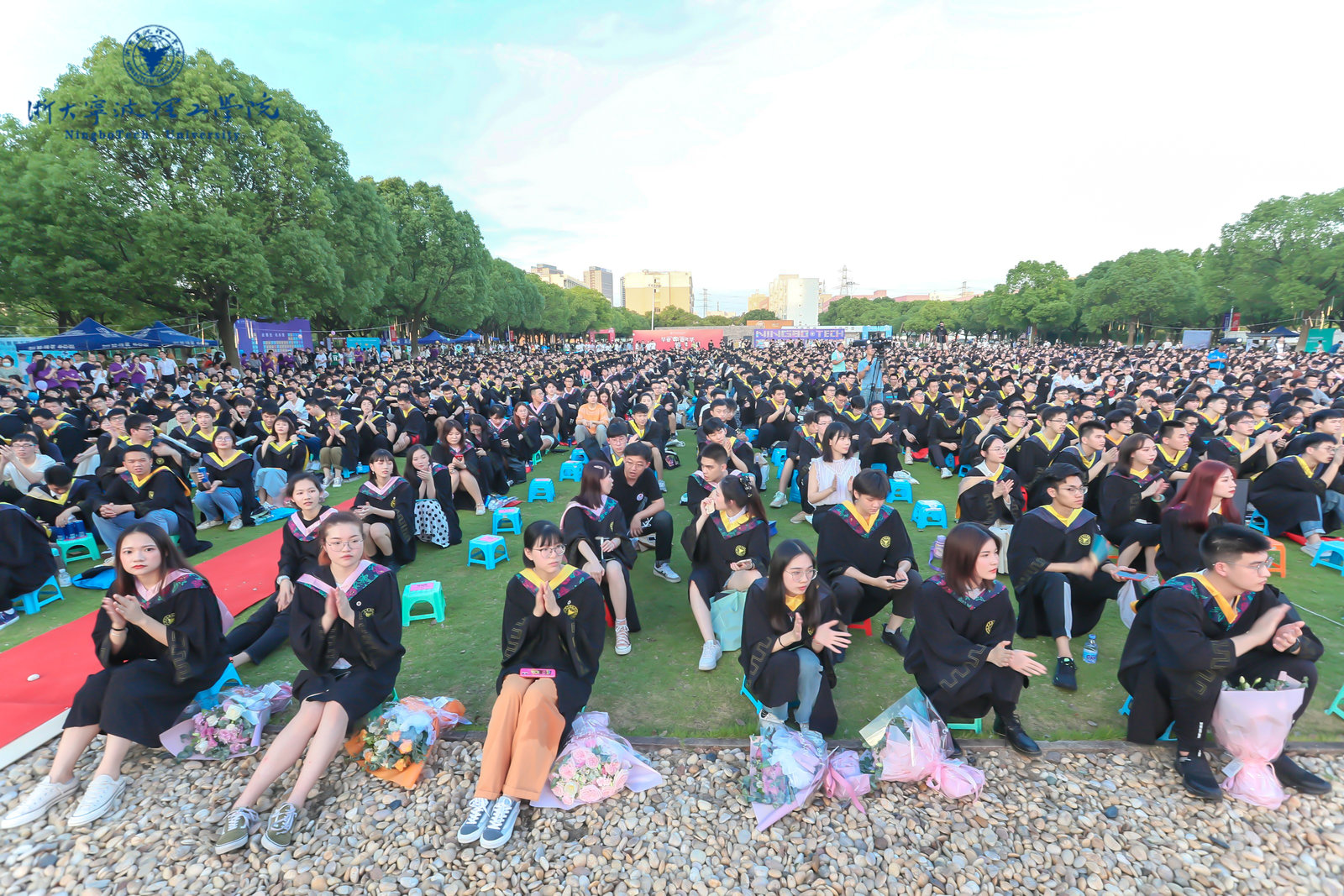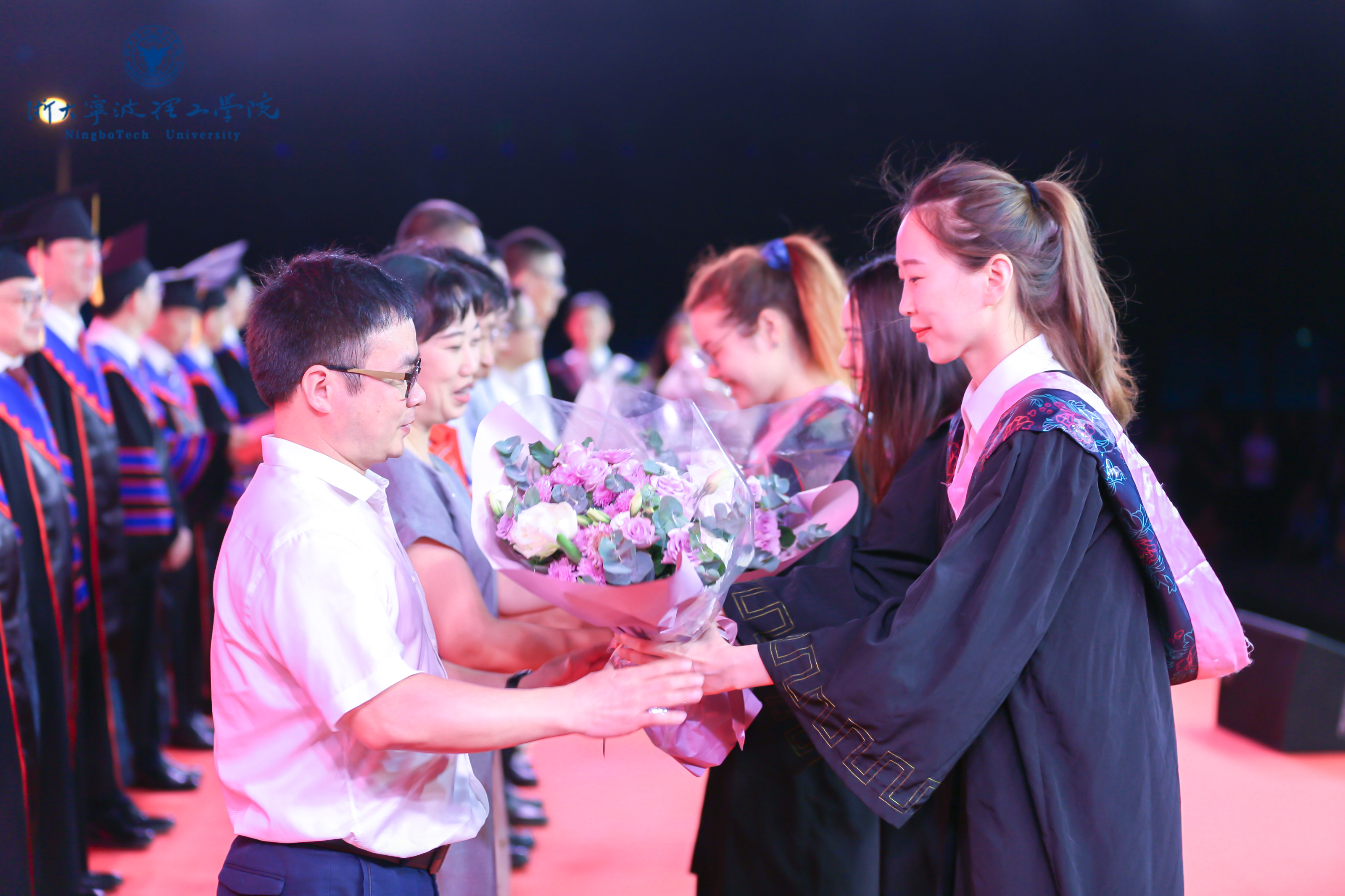 校友代表、在校生代表以及教职工代表均以视频的方式为毕业生们送上祝福。毕业生们则以鲜花感谢倾囊相授的师长、时刻守护校园的保安叔叔、悉心服务的后勤员工对大家一路走来的呵护与教导。