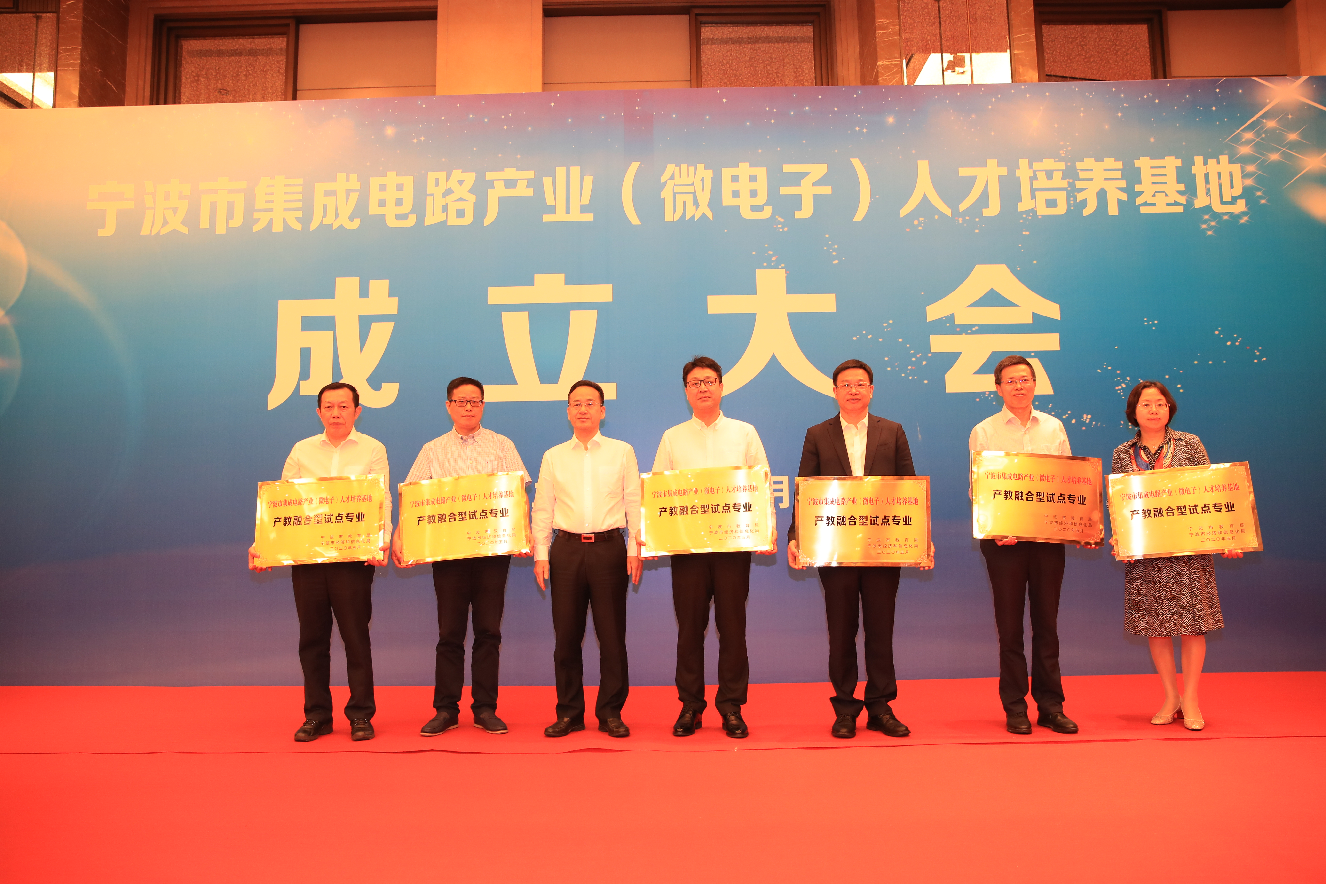 为贯彻落实市委、市政府重点发展“246”万千亿级产业集群的战略部署,推动宁波高校更好地服务于宁波集成电路产业发展。近日,在宁波泛太平洋大酒店举行宁波市集成电路(微电子)产业人才培养基地成立大会,学校信息学院电子信息工程专业成功入选宁波市集成电路(微电子)产业人才培养基地。副校长鲁东明、教务处长潘再平、信息学院电子信息工程专业负责人陶吉利参加会议。鲁东明副校长上台接受电子信息工程专业集成电路产教融合试点专业牌匾,并与宁波尚进自动化科技有限公司签订产教融合战略合作协议。