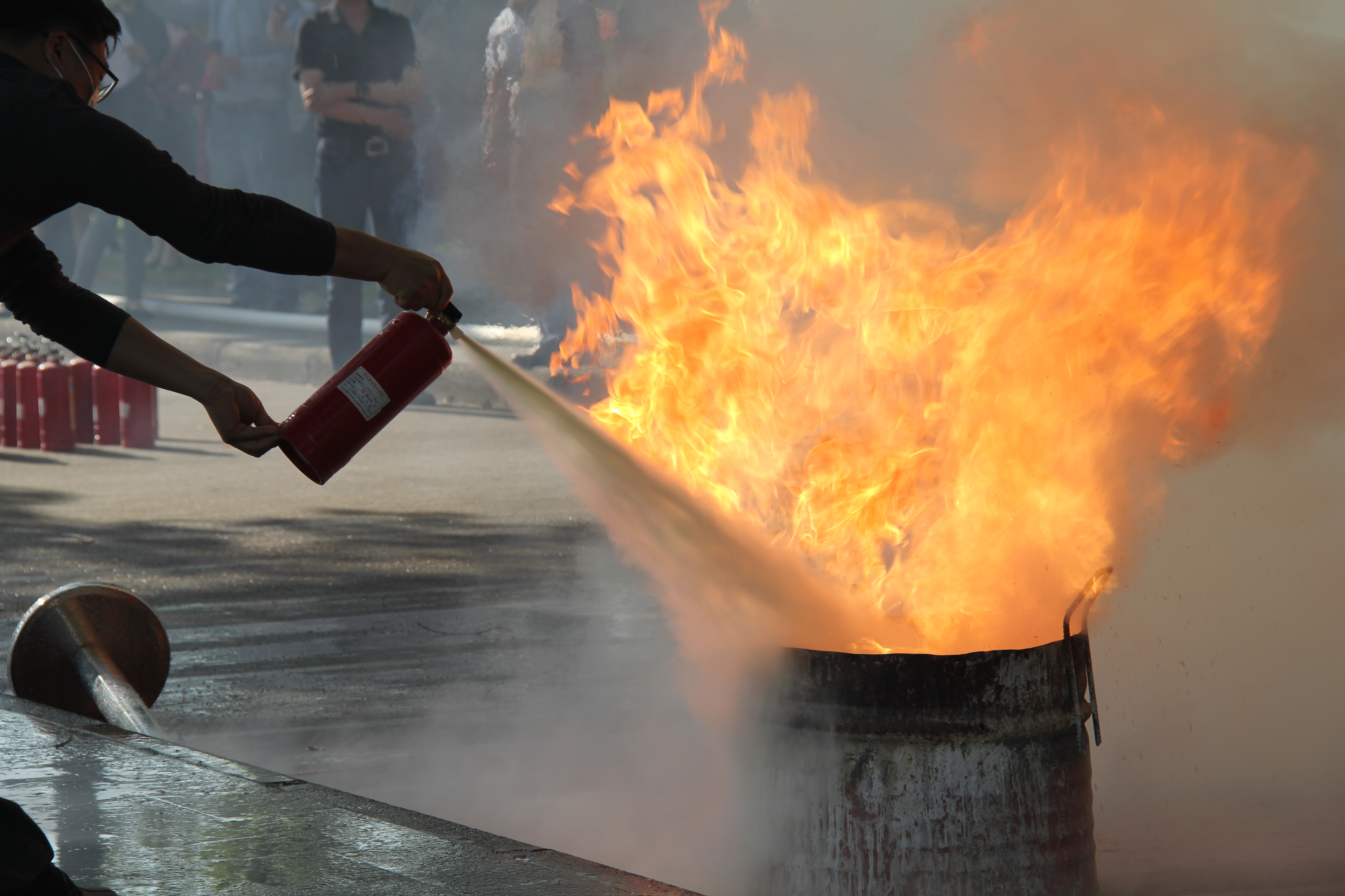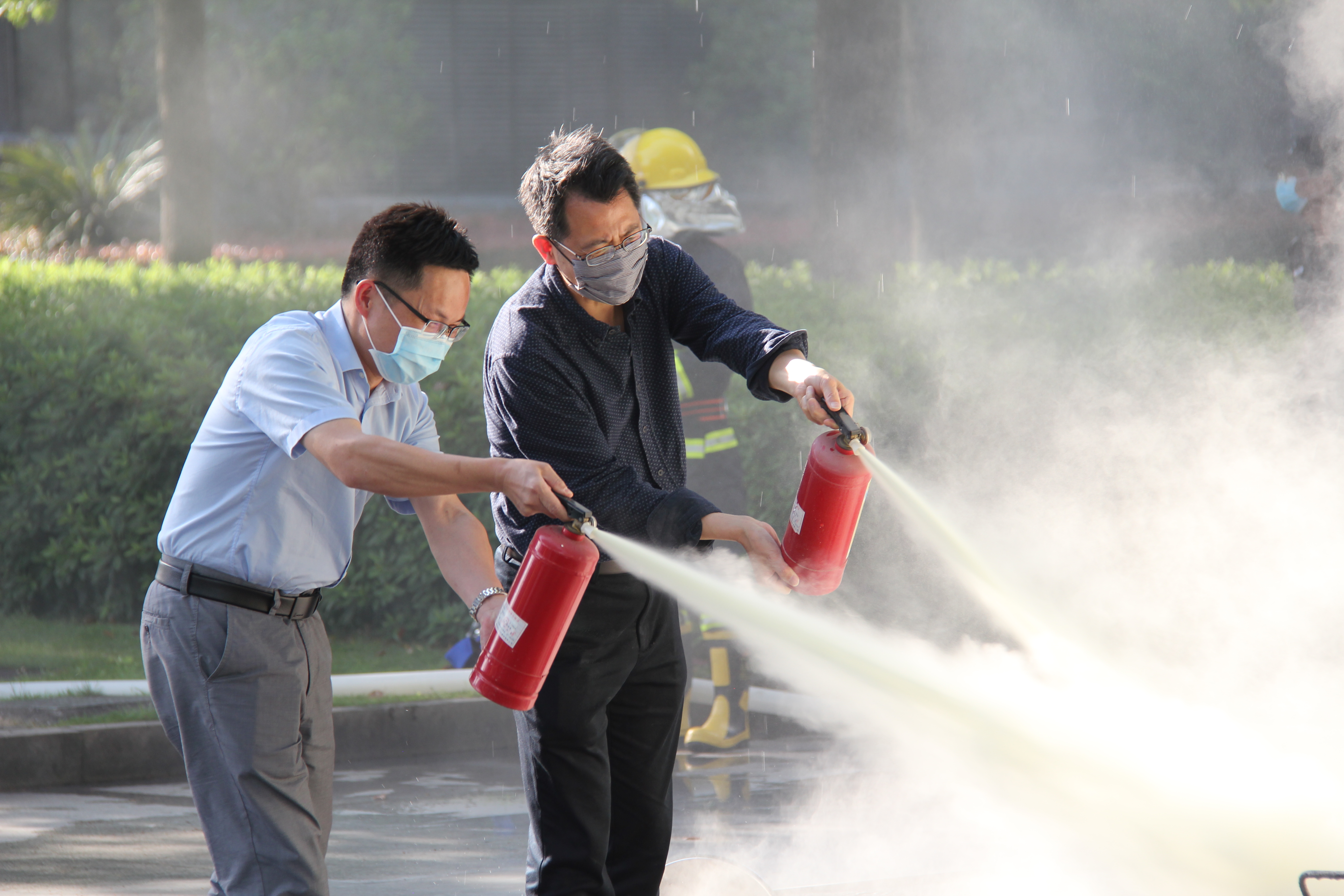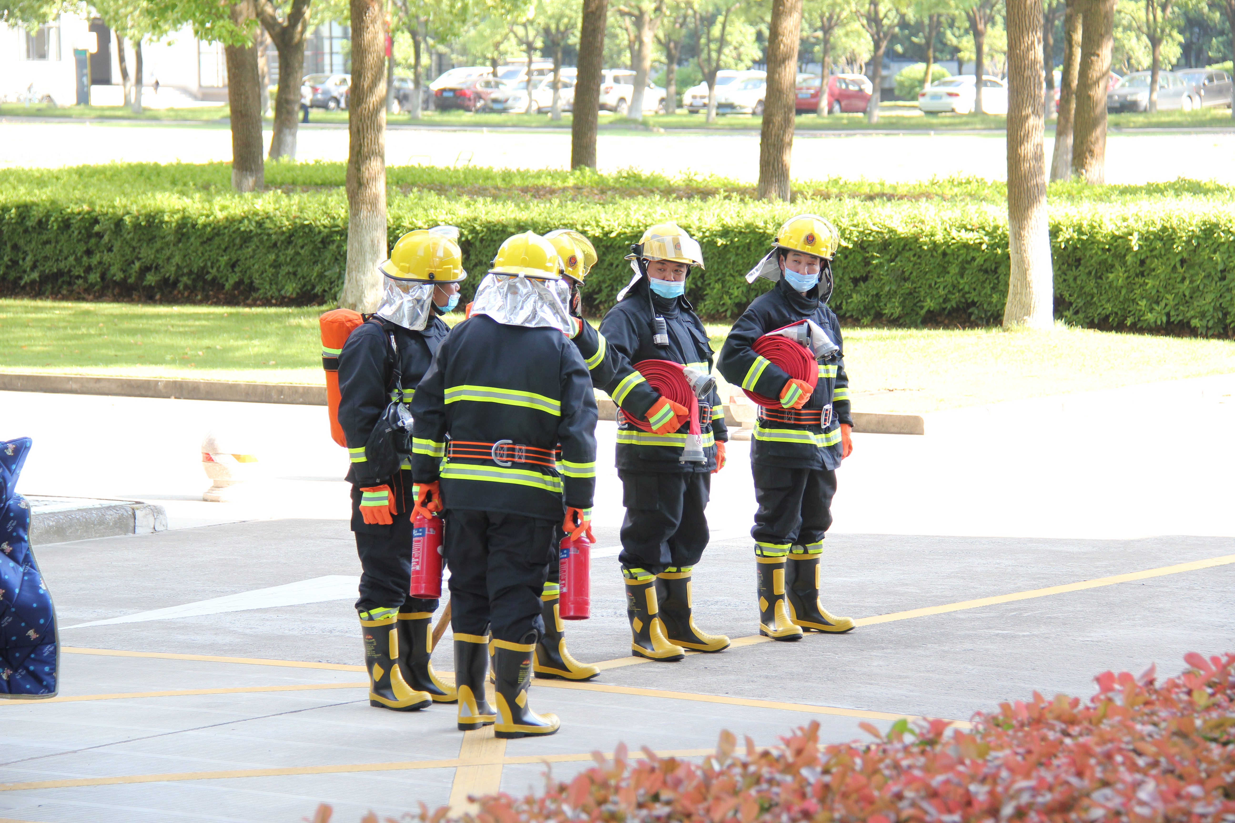 5月12日下午四时,学校举行防灾减灾应急疏散和灭火演练。行政楼十楼发生模拟火情,保卫处接到报告后模拟拨打“119”电话报警。6名学校志愿消防队员着消防服持消防器材进入楼内。各楼层有序疏散至行政楼大厅前广场,所有人员全程佩戴口罩,保持一米左右安全距离。施救结束后进行灭火器演练、消防水带出水操作。