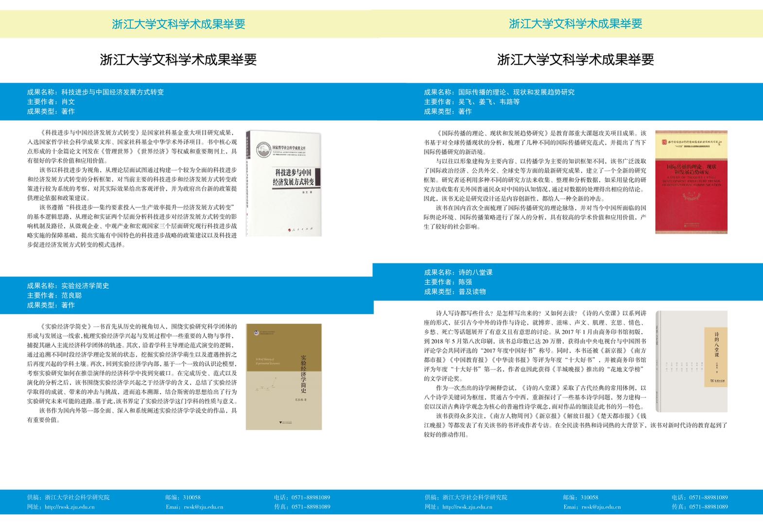 近日,浙江大学学报发布2020年首期成果举要,学校“9211”教授肖文著作《科技进步与中国经济发展方式转变》、吴飞著作《国际传播的理论、现状和发展趋势研究》被成功收录。