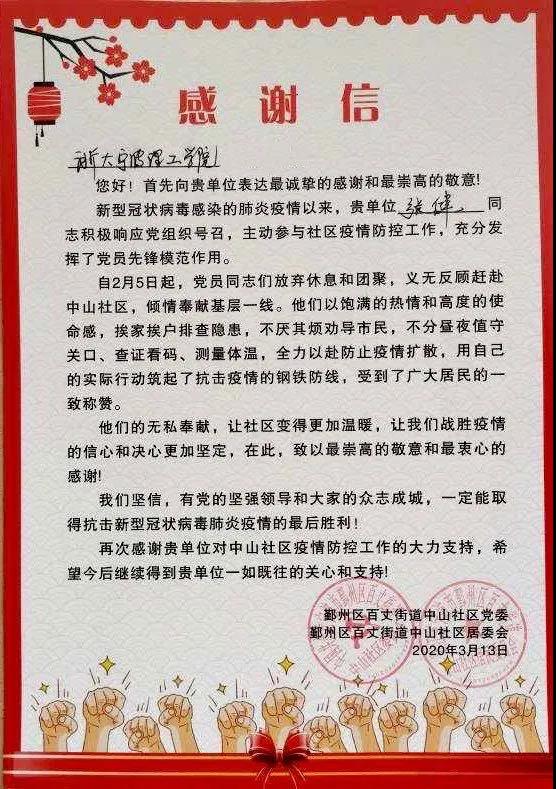 二个月的不懈努力,默默奉献,一直坚持到小区解禁,用自己的行动筑起了抗击疫情的钢铁防线,赢得了广大居民的高度肯定和好评。在社区抗击疫情的总结会上,大家一致对她这次抗疫工作中做出的奉献的给予了高度的评价,为此社区党委居委会特地写了一封感谢信致浙大宁波理工学院,以示衷心的感谢。