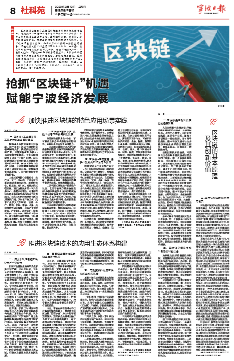 3月12日,《宁波日报》理论版整版刊发了学校“三江学者”、市金融研究院院长孙伍琴教授领衔完成的专题文章《抢抓“区块链+”机遇 赋能宁波经济发展》。该专题文章分三个主题,从金融科技和金融创新层面,对区块链的基本原理及其创新价值、加快推进区块链的特色应用场景实践、推进区块链技术的应用生态体系构建等主要方面进行了深入探讨,并为区块链技术与赋能宁波制造业、港口经济的智能化发展及提高宁波外向型经济竞争优势提出了政策建议。该文章同时也是市金融发展与保险创新研究基地的重要成果,得到了市保税区财政局领导的大力支持。