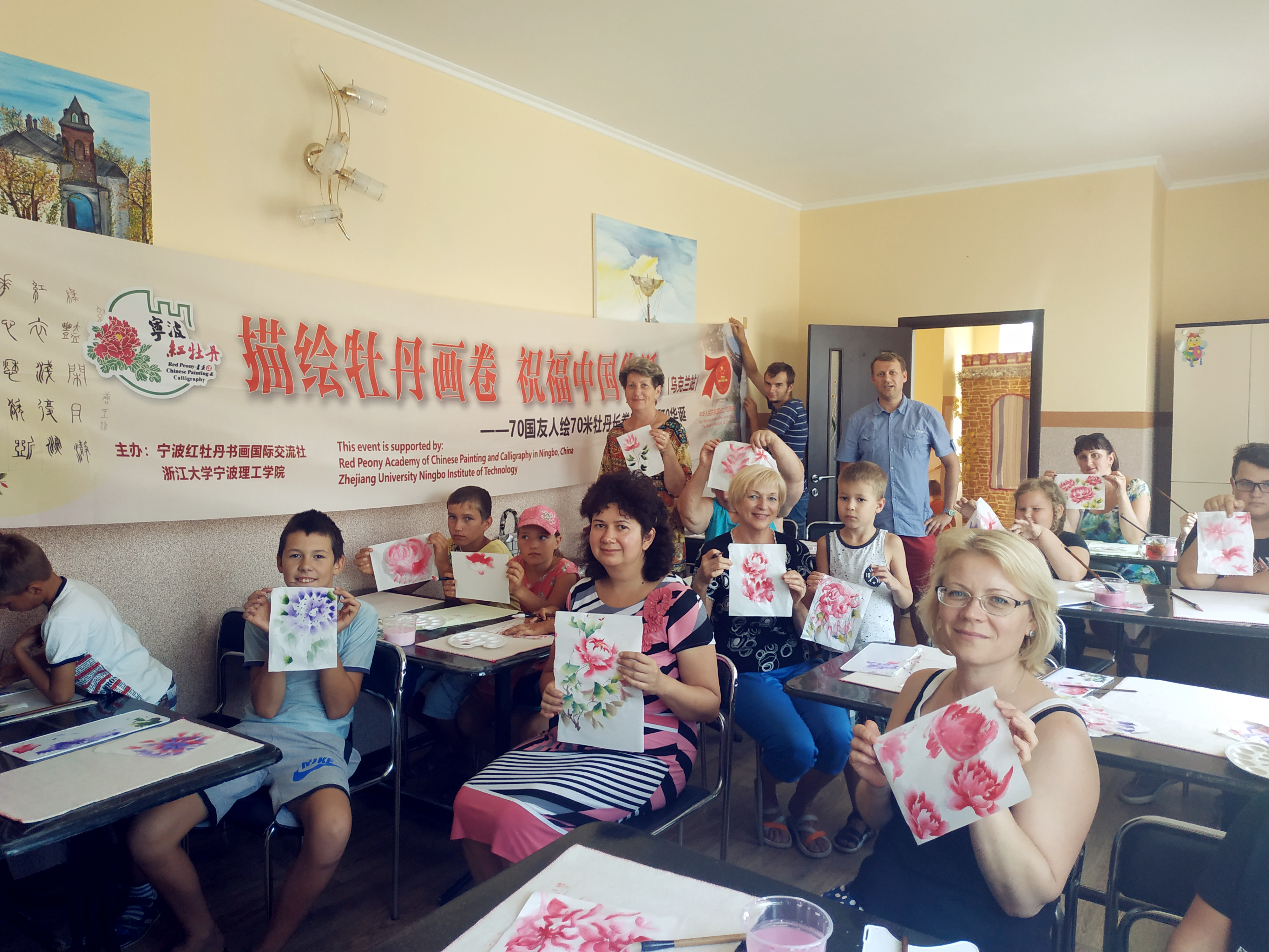 学校乌克兰籍外教康斯坦丁博士,说得一口流利的汉语,人称“康哥”,来校工作六年,工作之余,痴迷丹青,习得一手牡丹国画技艺。2019年,正值新中国七十华诞,他在暑期回乌克兰探亲之际,组织开展了“描绘牡丹画卷 祝福中国华诞”系列国画传播活动,到当地学校和文化机构手把手教授牡丹画法,获得乌克兰中国文化爱好者和学校小朋友们的喜爱与欢迎。在2018年浙江省西湖友谊奖的颁奖典礼后,“康哥”还向省长袁家军展示并赠送了自己的绘画作品,直至今日仍令他回味悠长,充满自豪。