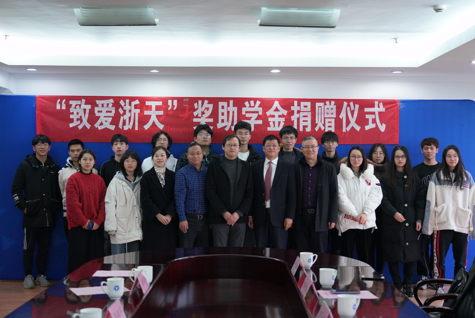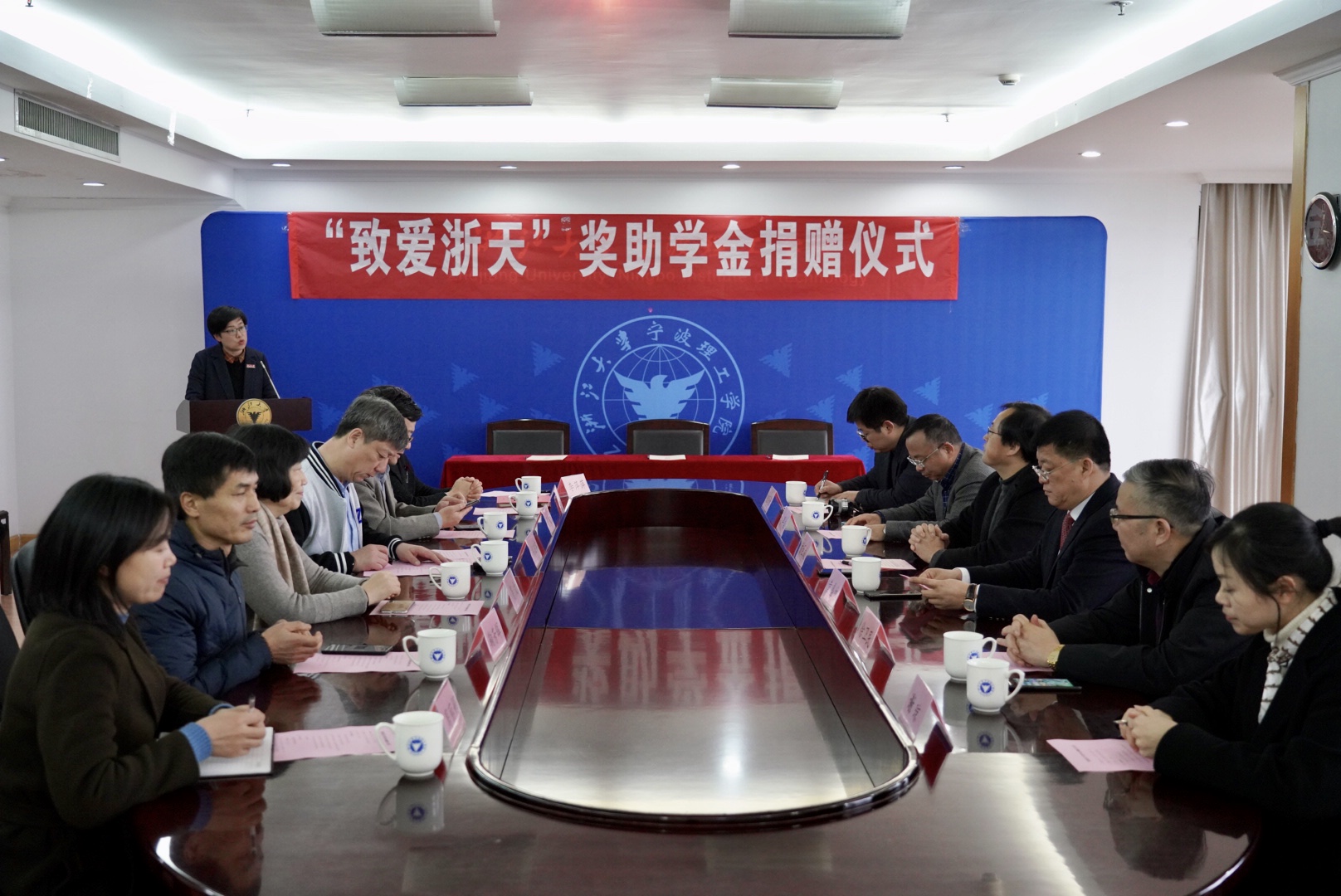 1月15日下午,“致爱浙天”奖助学金捐赠仪式在学校行政楼602举行。致公党宁波市委员会、浙天集团有限公司向学校教育发展基金会捐赠70万元,设立“致爱浙天”奖助学金,用于资助学校商学院优秀学生和贫困学子。
