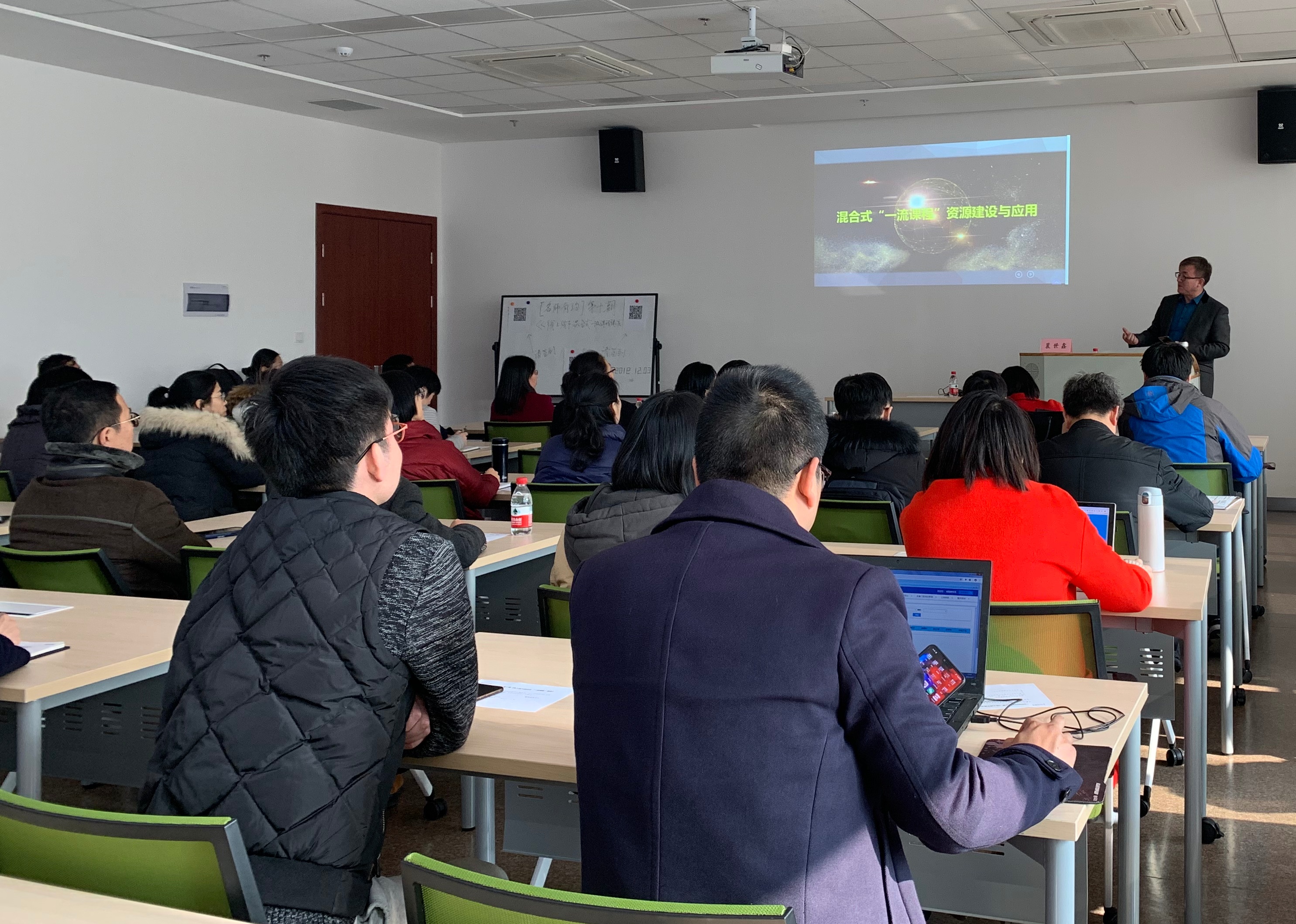 裴教授从“为什么要做混合式课程资源建设”讲起,对“一流课程”的概念及云端课程资源的结构做了详细介绍,与教师们分享了云端课程资源建设经验及案例,并以自己所授课程为例,分析了基于云端课程资源的“混合式”教学实施效果,阐述了对“一流课程”申报的几点思考。
