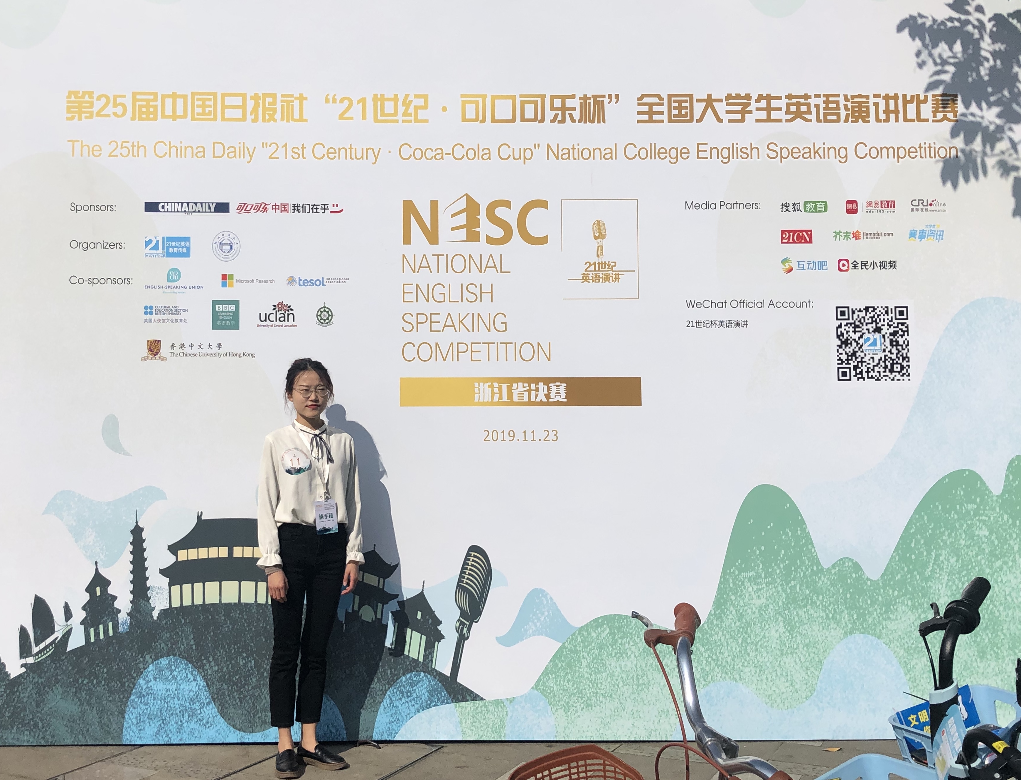 2019年11月23日,学校外国语学院2018级英语专业钟明月同学代表学校参加了杭州师范大学承办的第二十五届中国日报社21世纪全国英语演讲比赛浙江地区决赛,获得三等奖。