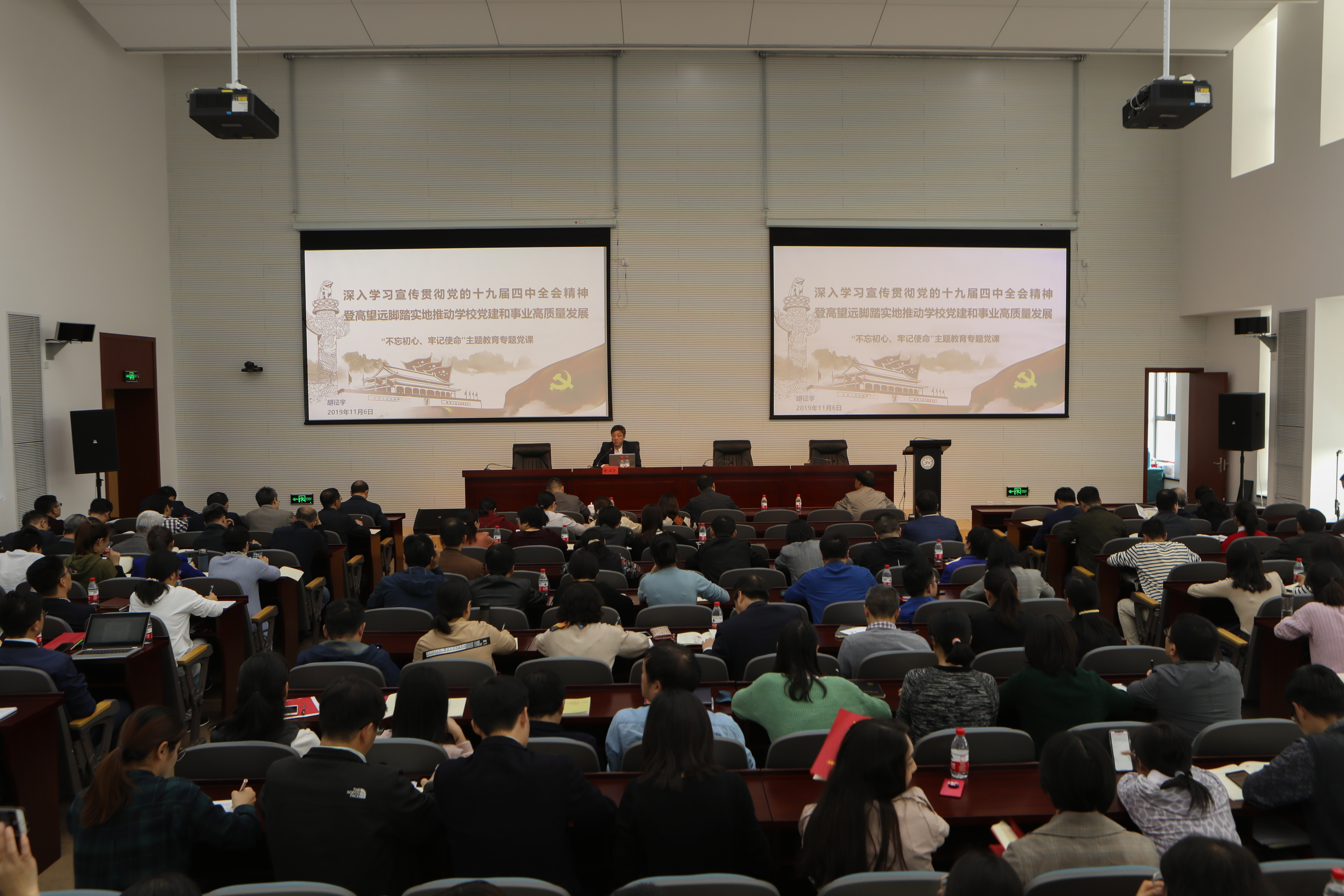 11月6日下午2点,学校党委结合“不忘初心、牢记使命”主题教育专题党课安排,召开党的十九届四中全会精神学习会。学校党委书记胡征宇主持召开并作《深入学习宣传贯彻党的十九届四中全会精神 登高望远脚踏实地推进学校党建和事业高质量发展》专题党课。