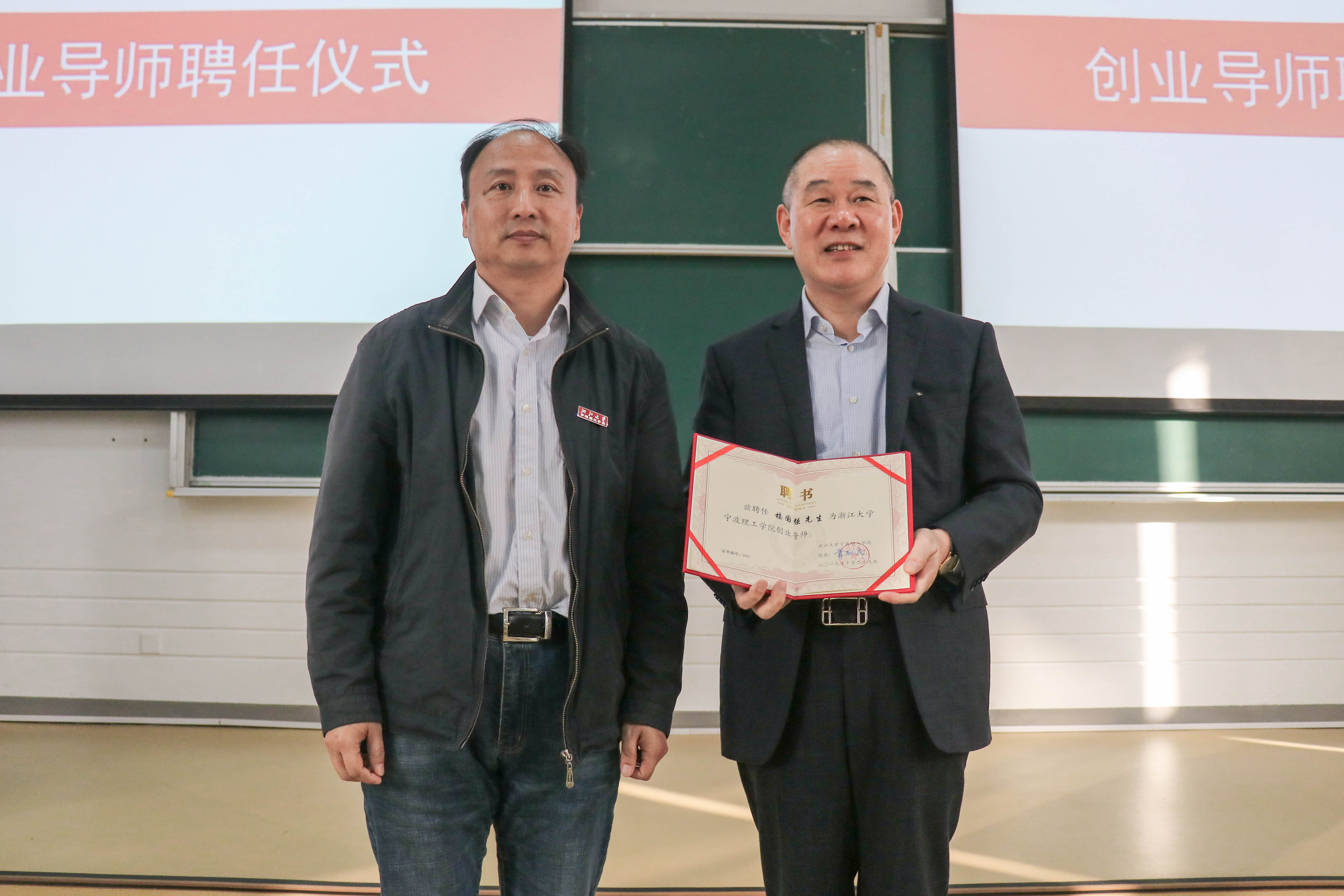冯建波为楼国强颁发了学校创业导师聘任证书并佩戴校徽。