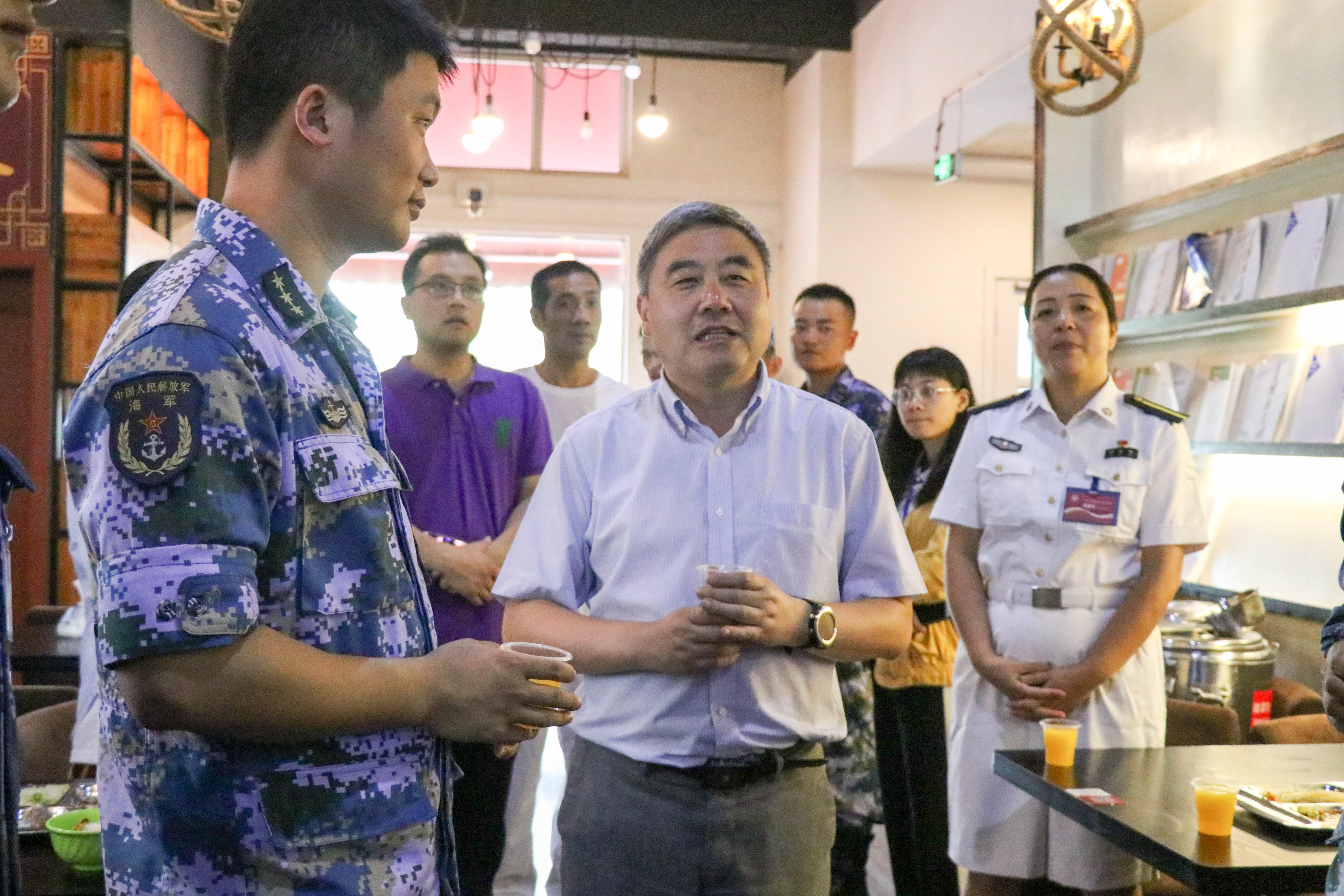 在承训官兵就餐的求是园餐厅,章献民代表学院党委和行政向承训官兵表示感谢,他讲道,学院给官兵们提供的食宿条件是有限的,希望官兵们能够理解和克服。他表示,军训是大学生活的第一课,希望官兵们能把军队的好传统、好作风传递给2019级的新生们。