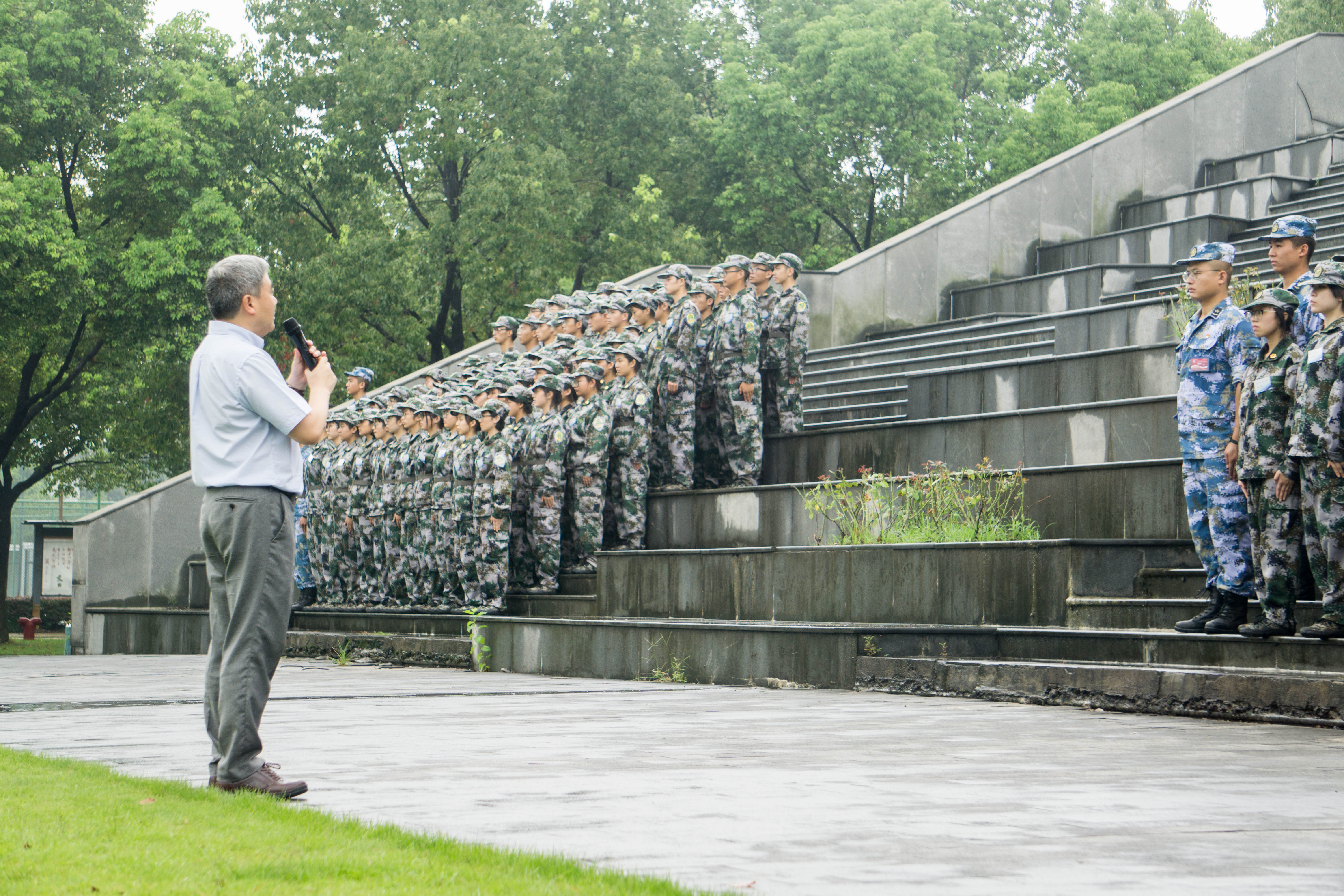 在十连、十一连训练的场地,章献民一行人向参训学员代表与教官代表发放了慰问品并与学员们进行了亲切的交谈,章献民提到,如同军人有自己的责任和理想,希望学员们也能够明确学习目标,树立起远大的理想信念,将军训作为大学生活的良好开端。天空中飘起雨丝,学员们仍挺拔身姿,聆听院长的教诲。