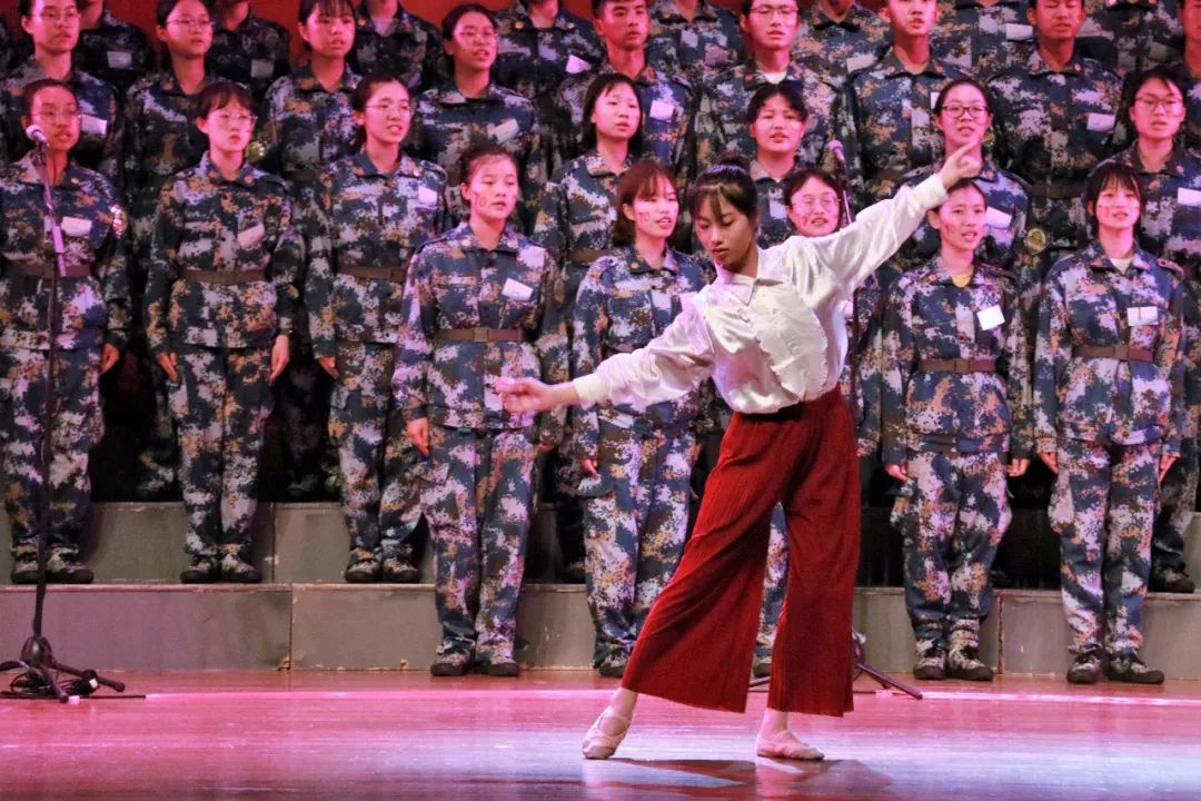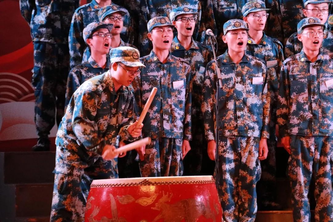 大合唱比赛当晚,秋雨打着“咚咚”的鼓点,全体参训学员以一曲《大学生军训之歌》开场,唱出了当代大学生的蓬勃朝气与青春激情。合唱比赛分为三个篇章,在第一篇章“开天辟地新中国”中,十五连学员以一曲气势磅礴的《保卫黄河》,唱出了中华民族面对危难不屈不挠,自强不息的伟大民族精神气;“我们都是神枪手,每一颗子弹消灭一个敌人……”在嘹亮的歌声中,六连伴着架子鼓的铿锵而来,唱出了游击队员不怕山高密林深,不畏粮少弹药缺的英勇气概;二连将合唱与舞蹈相结合,以舞蹈的形式将长江的柔美生动地展示出来;时逢祖国母亲70华诞,每一个中国儿女的心中都洋溢着满满的民族自豪感,一曲《我的中国心》唱出了在场所有人的共同心声;在激情飞扬的指挥中,三连学员上场演唱一曲《天耀中华》,声情并茂的歌声,伴着柔美秀丽的舞蹈,结尾别出心裁共同拼出的国旗图案,震撼着在场每一个观众。《精忠报国》、《走向复兴》、《长江之歌》、《红旗飘飘》等一首首经典曲目,在各连队的精彩演绎下,向观众们诉说着当代大学生对民族、对国家的深深热爱与对历史、对文化的无比自豪。临近尾声,由承训教官方队带来的《当祖国召唤的时候》让所有人的目光聚焦在了这群英勇的人身上。最后,由校领导牵头,联合各班助、军训团各干部联袂演唱《我和我的祖国》,军训大合唱在与会场的热情互动中走向高潮,圆满结束。
