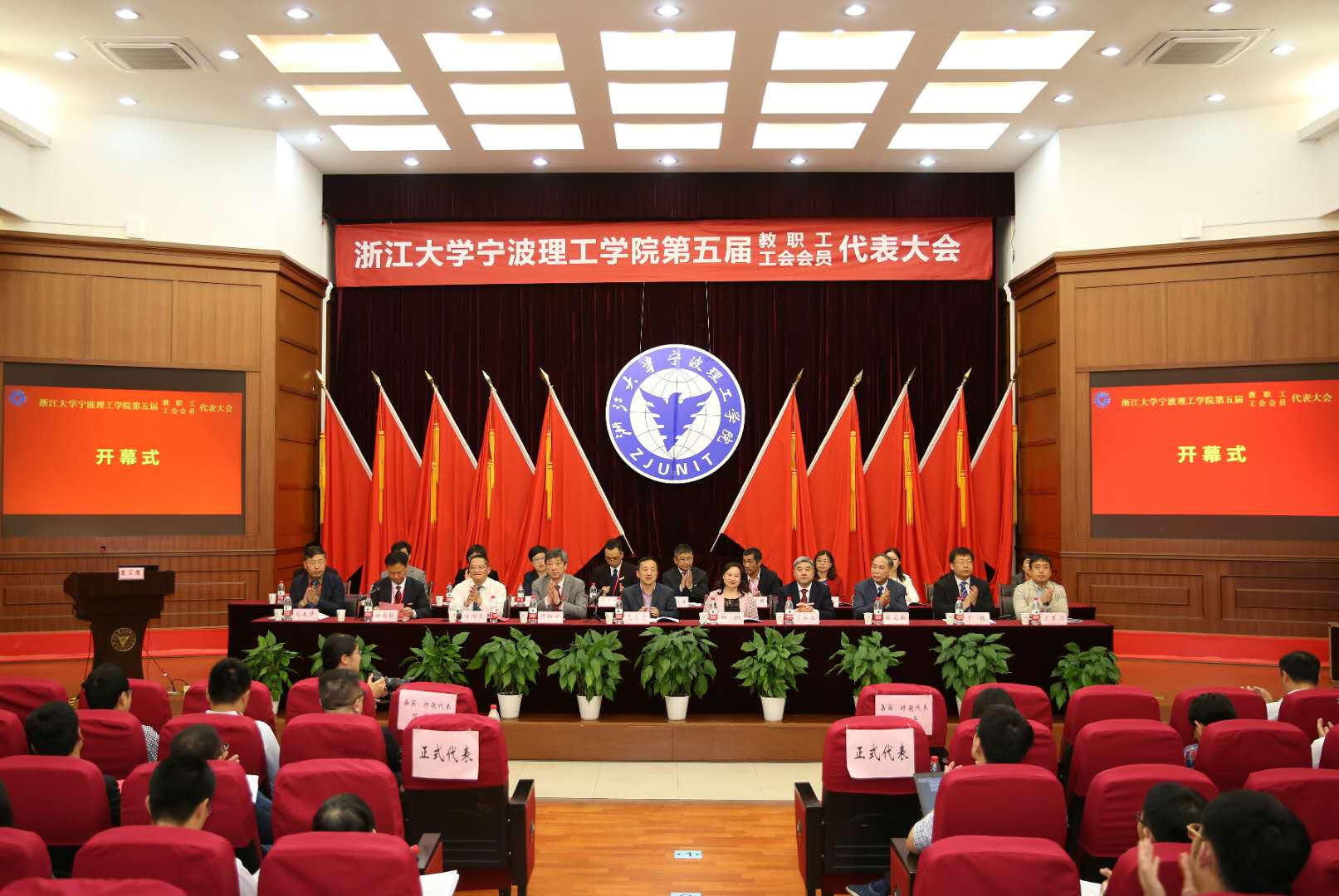 大会在催人奋进的《国歌》齐唱中开幕。宁波市教育工会主席马小平、浙江大学工会副主席林俐出席开幕式并致辞。党委书记胡征宇致开幕词。院长章献民作学校工作报告,党委副书记、纪委书记、工会主席顾禹标代表第四届教代会执委会、工会委员会作报告。团委副书记夏文来代表群团组织致贺词。大会正式代表,在甬校领导班子成员,老领导许为民、费英勤、俞春鸣,各单位非正式代表主要负责人等出席大会。