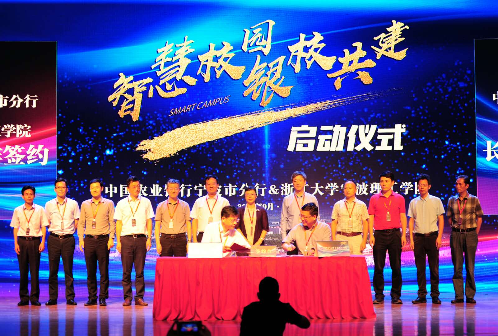 9月26日,“智慧校园”银校共建启动仪式在我校举办,农行总行网络金融部总经理张秀萍,学校党委书记胡征宇,农行宁波市分行党委书记、行长彭超英出席并致辞。农行宁波市分行党委委员、副行长胡炜铭、孙国锋,农行总行网络金融部消费商户管理处处长梅铮、高级专员阚方圆,学校副院长冯建波、副书记黄光杰等参加。