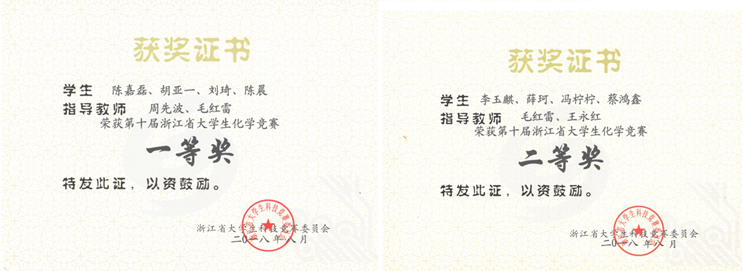 本届竞赛共有来自全省38所高校的565支队伍参加比赛,337支参赛队伍提交有效研究作品,经“创新项目研究”、“化学知识测试”、“现场答辩”、“虚拟仿真能力测试”和“实践能力考核”五个环节的比赛,我校代表队表现突出,其中由周先波、毛红雷老师指导,陈嘉磊、胡亚一、刘琦、陈晨组成的代表队夺得了一等奖的好成绩,另五个参赛队伍分别获得一个二等奖和四个三等奖。