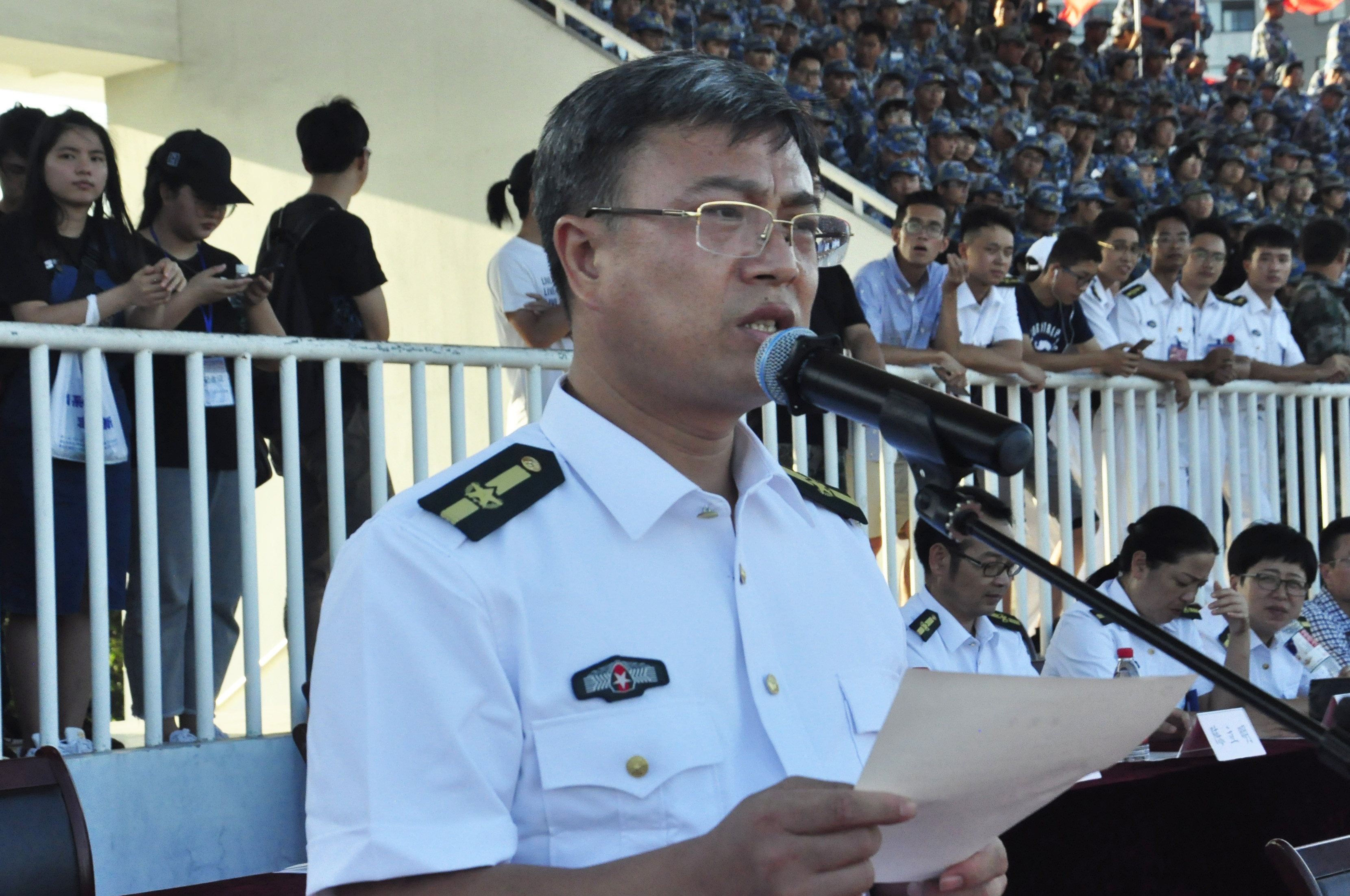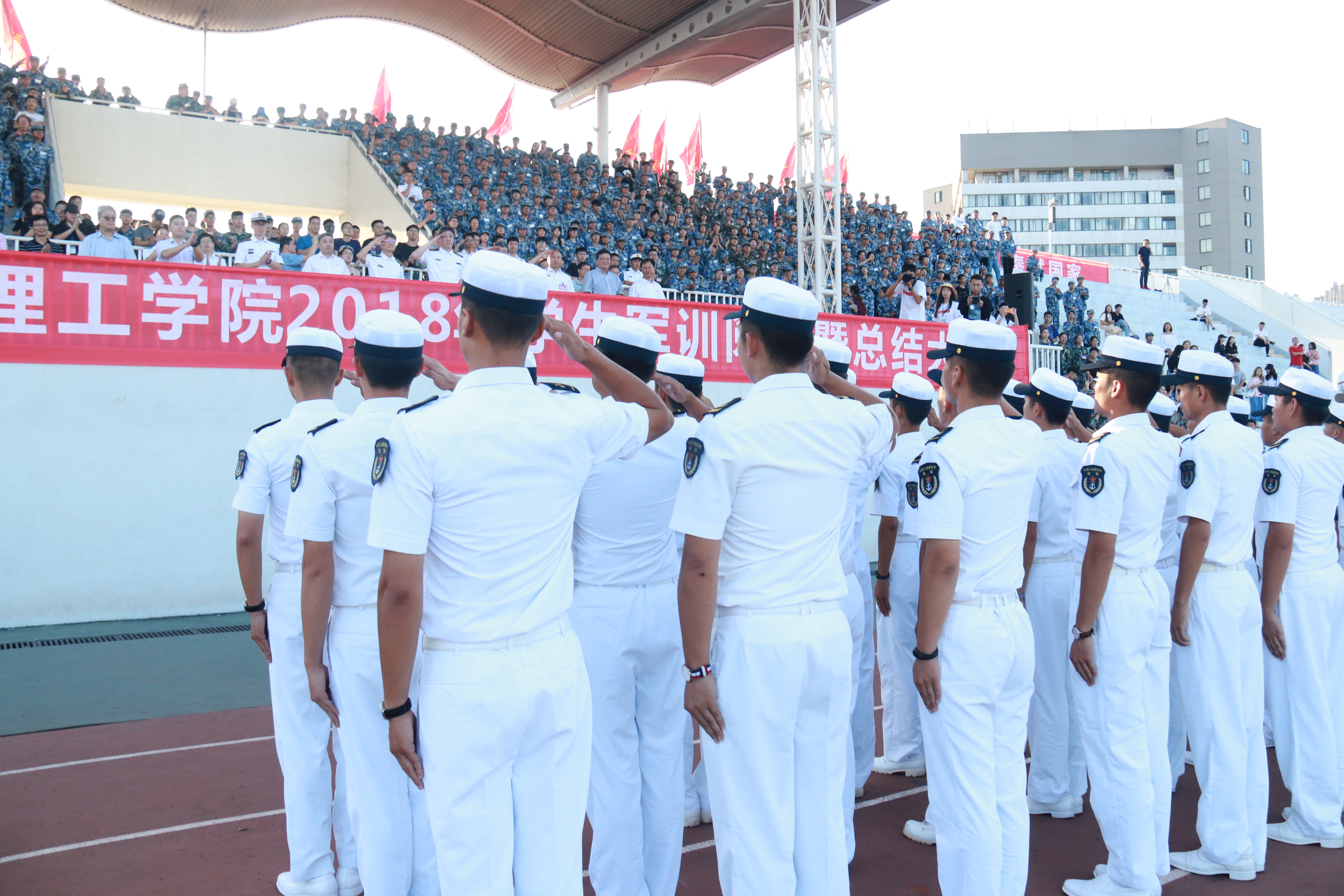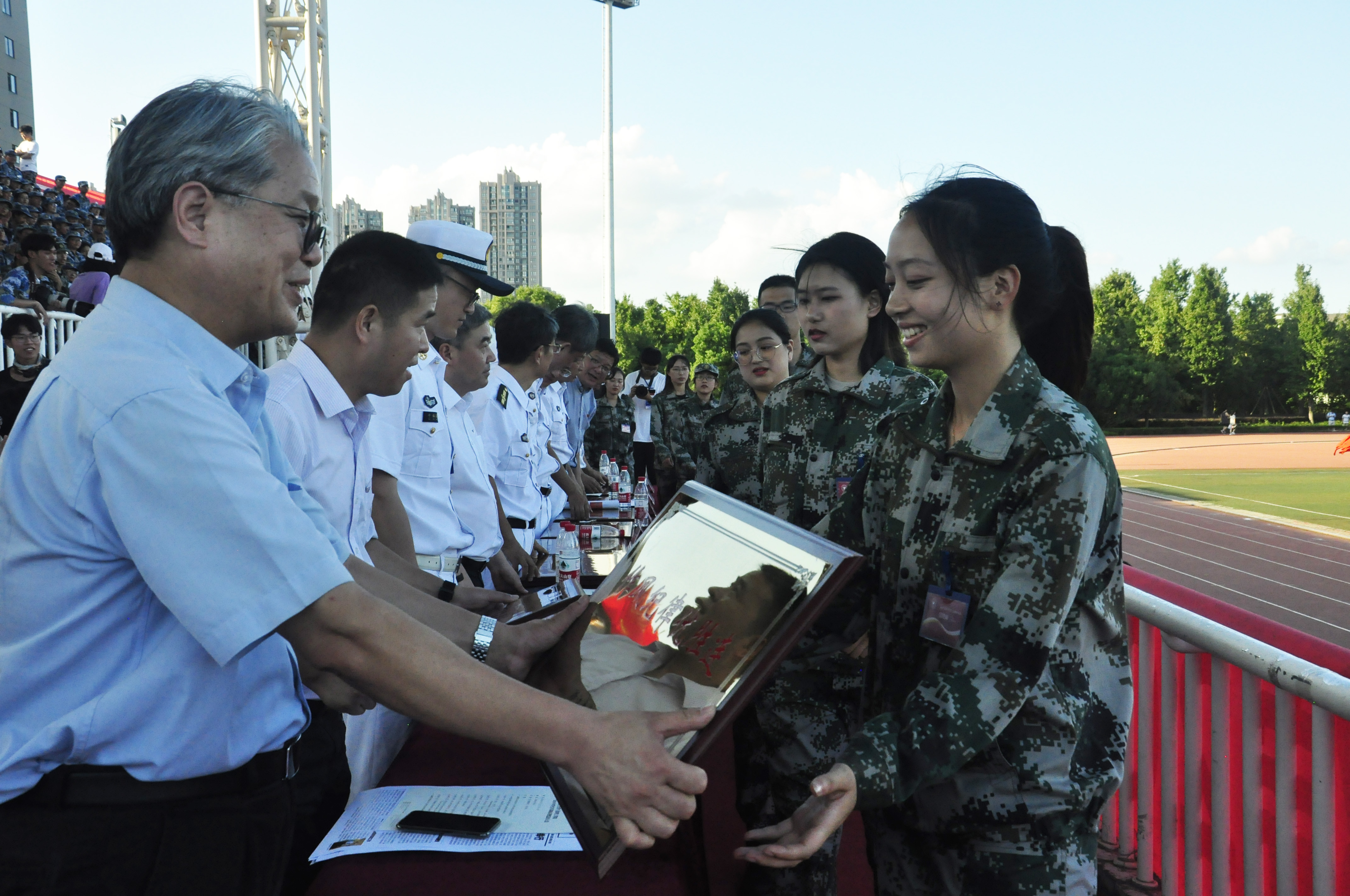 总结大会上,郑强发表激情洋溢的讲话。他风趣地讲道,自己刚就诊完从医院出来,就赶来参加宁波理工学院的阅兵式,“牺牲”在路上都值得。他对全体学员阳光灿烂、富有朝气的阅兵表现赞叹不已;语重心长地告诉同学们“人生的成功不是高考分数决定的,而是未来道路上的努力决定的。”他代表学校向承担本次军训任务的91428部队和承训官兵表示敬意和感谢,并深情地表达了自己对解放军的热爱、对国防事业的热爱。他说,今天是自己第一次穿上漂亮的海军服,给自己人生留下最难忘、最美丽的记忆,和孩子们一样,为这一难忘的时刻感到庆幸与骄傲。他祝愿同学们在未来的学习和成长中取得更大的成绩,二十年后再回首,无悔今天的军训、无悔今天的选择。郑强的讲话简短有力,饱含深情,幽默风趣,全场掌声不断。