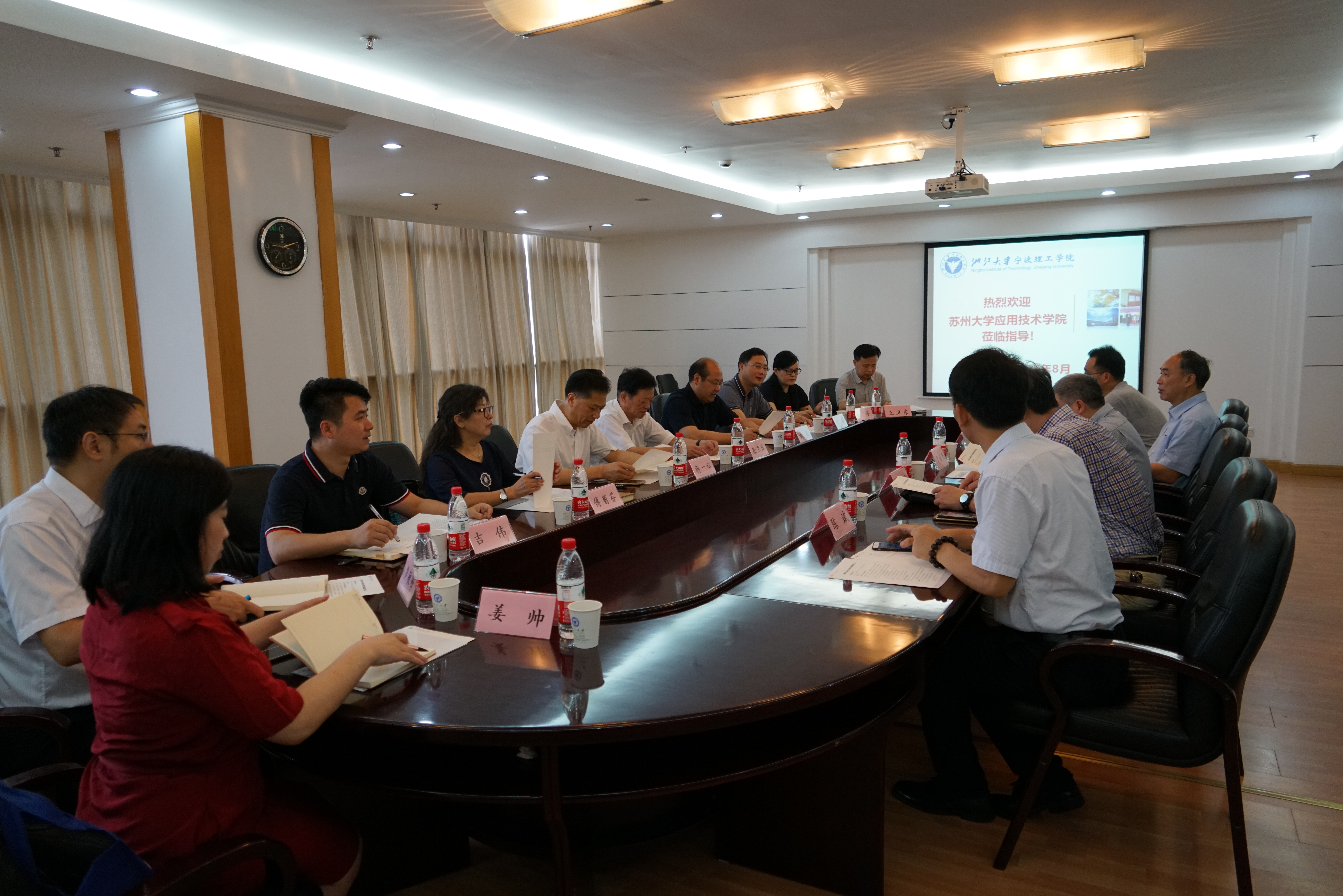 8月2日上午,苏州大学应用技术学院理事长、昆山创业控股集团董事长徐卫球,苏州大学应用科技学院副理事长、苏州大学副校长杨一心,苏州大学应用科技学院理事、苏州大学副校长刘标,苏州大学应用技术学院理事、院长傅菊芬等一行10人来校调研。学院院长章献民,学院党委书记胡征宇,浙大宁波校区筹委会副主任、原学院党委书记费英勤等会面交流。