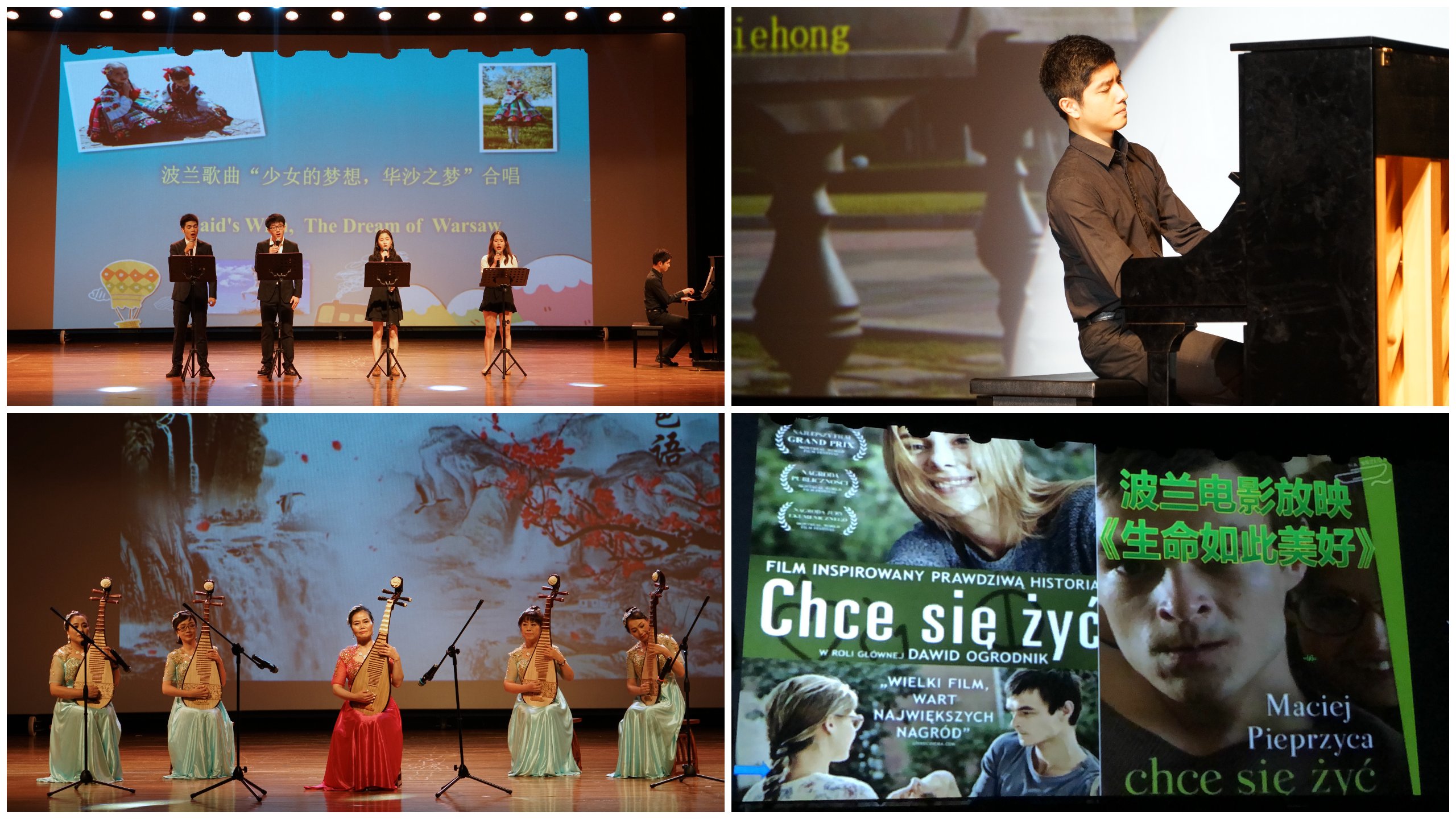 开幕式上,理工师生精心准备的无伴奏波兰语歌曲《少女的梦想》和《华沙之梦》、钢琴独奏《肖邦夜曲》以及琵琶弹奏《琵琶语》和《茉莉花》给现场的嘉宾们留下了深刻的印象。之后,现场嘉宾和师生们一起观看了波兰励志电影《生命如此美好》。