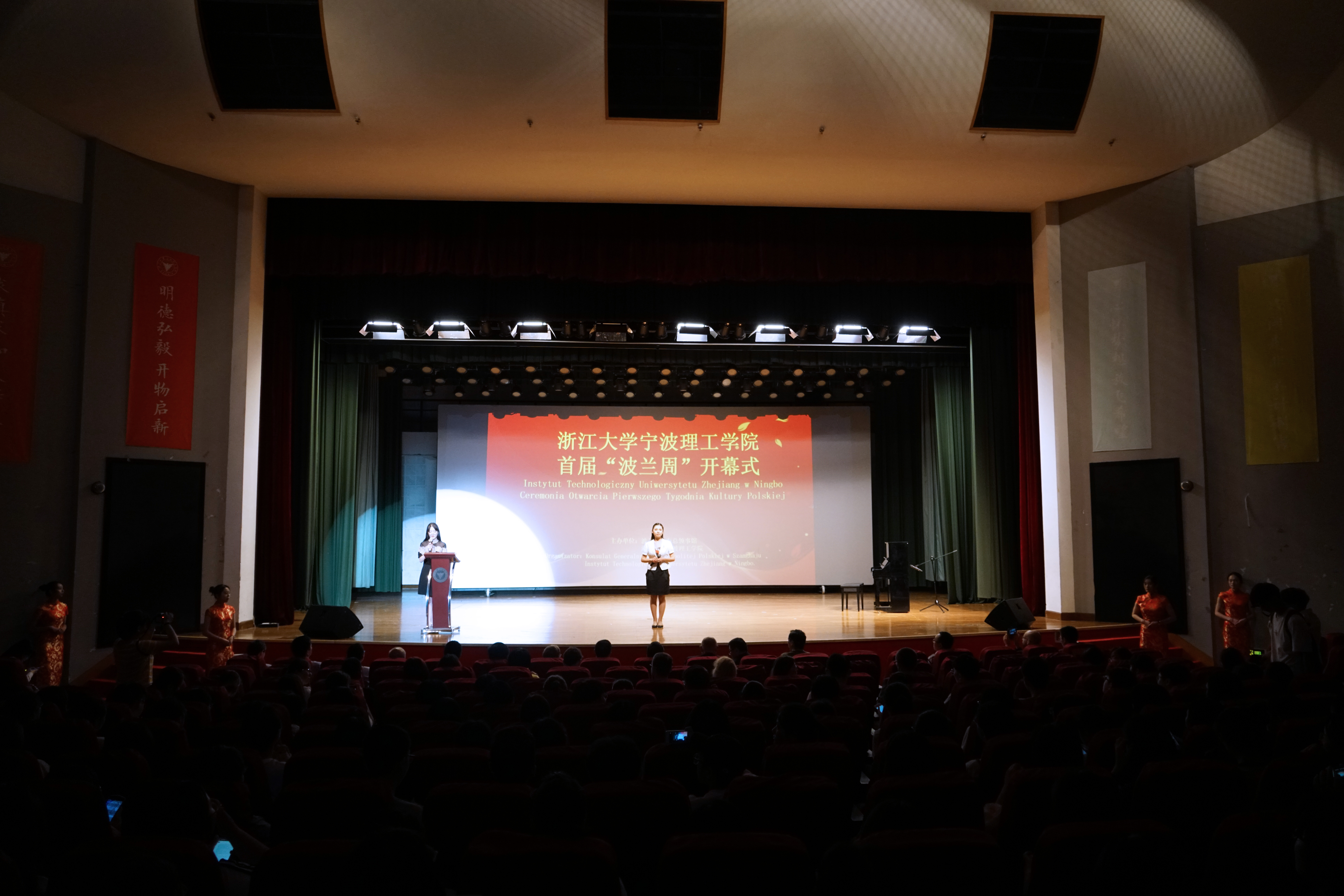 由波兰驻上海总领事馆和浙江大学宁波理工学院联合主办的“波兰周”活动开幕式于5月30日晚在学校可珍讲堂举行。波兰驻上海总领事彼得·诺沃特尼亚克、宁波市外事办副主任陈国苗、宁波市教育局副巡视员汪维民、北京外国语大学赵刚教授、浙江师范大学王辉教授、上海外国语大学托马什·艾威尔托夫斯基博士、我校金伟良院长、杨建刚副院长等出席本次开幕式。我校金伟良院长、波兰驻上海总领事彼得·诺沃特尼亚克和宁波市外事办副主任陈国苗分别致辞,开幕式由我校外国语学院院长王小潞主持。