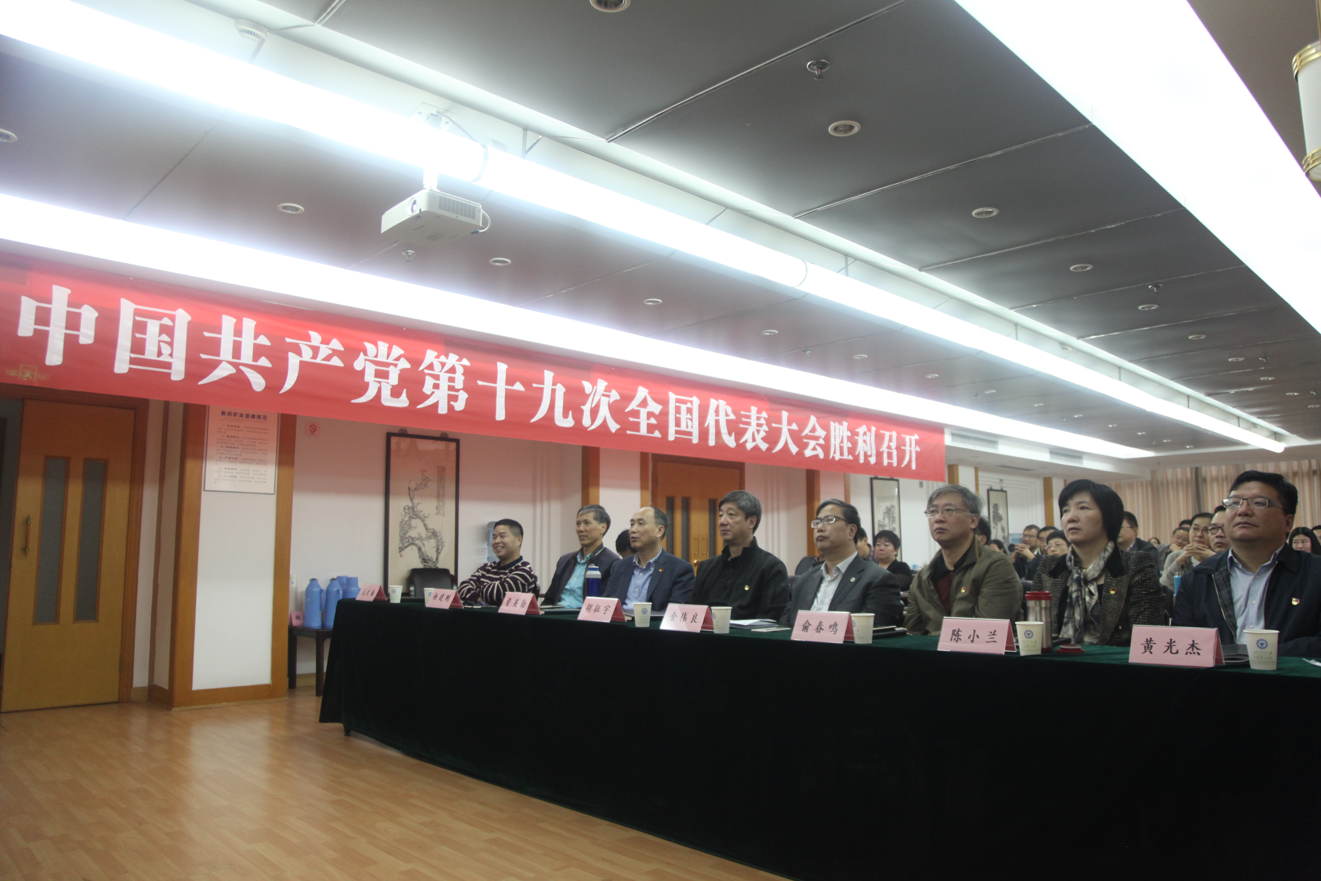 在行政楼603会议室,浙江大学校长助理胡征宇,我校全体校领导,各总支(党委)负责人,机关党总支成员等观看十九大开幕会盛况。学校团委组织共青团员代表在NC202、红星书房(生活园区党员之家)、学生食堂等处聆听党的十九大报告。学校各学院、各单位也分别采取集中和分散等不同形式组织观看了开幕会盛况。