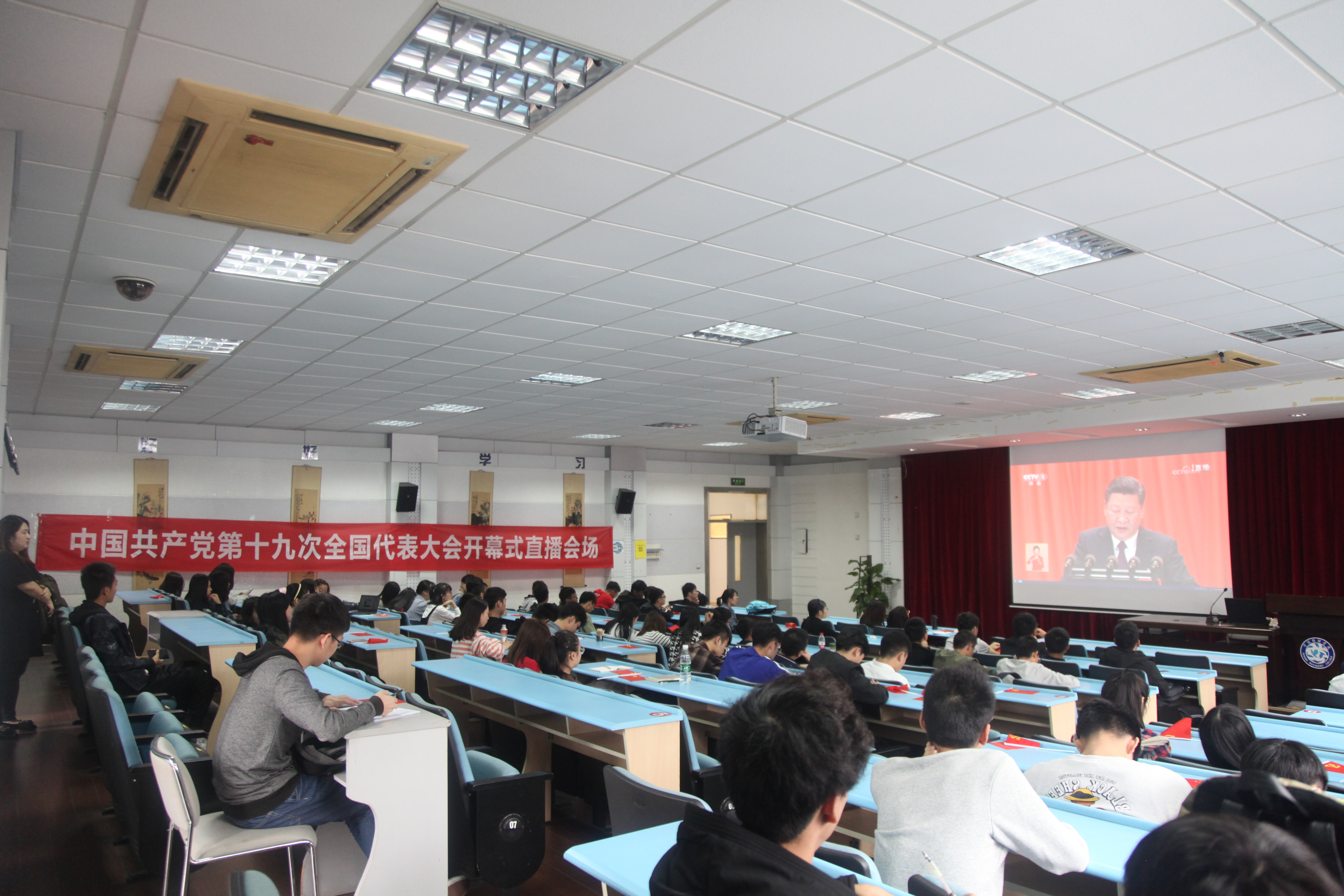 据悉,学校还利用弘毅园餐厅大屏幕于18日全天候播放党的十九大开幕会及实况报道,全力做好党的十九大宣传工作。