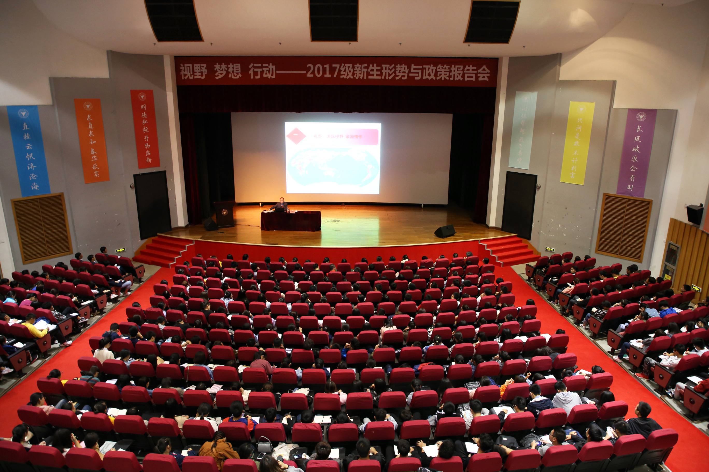 宣讲形势与政策是坚持立德树人,加强大学生思想政治教育工作的重要渠道。10月17日晚6:30,学校党委书记费英勤以“视野、梦想、行动”为主题,在可珍讲堂为2017级新生作形势与政策报告。学工部(团委)负责人、学院党委(党总支)负责人、思政理论部相关教师以及全体《形势与政策》课助教参加报告会。