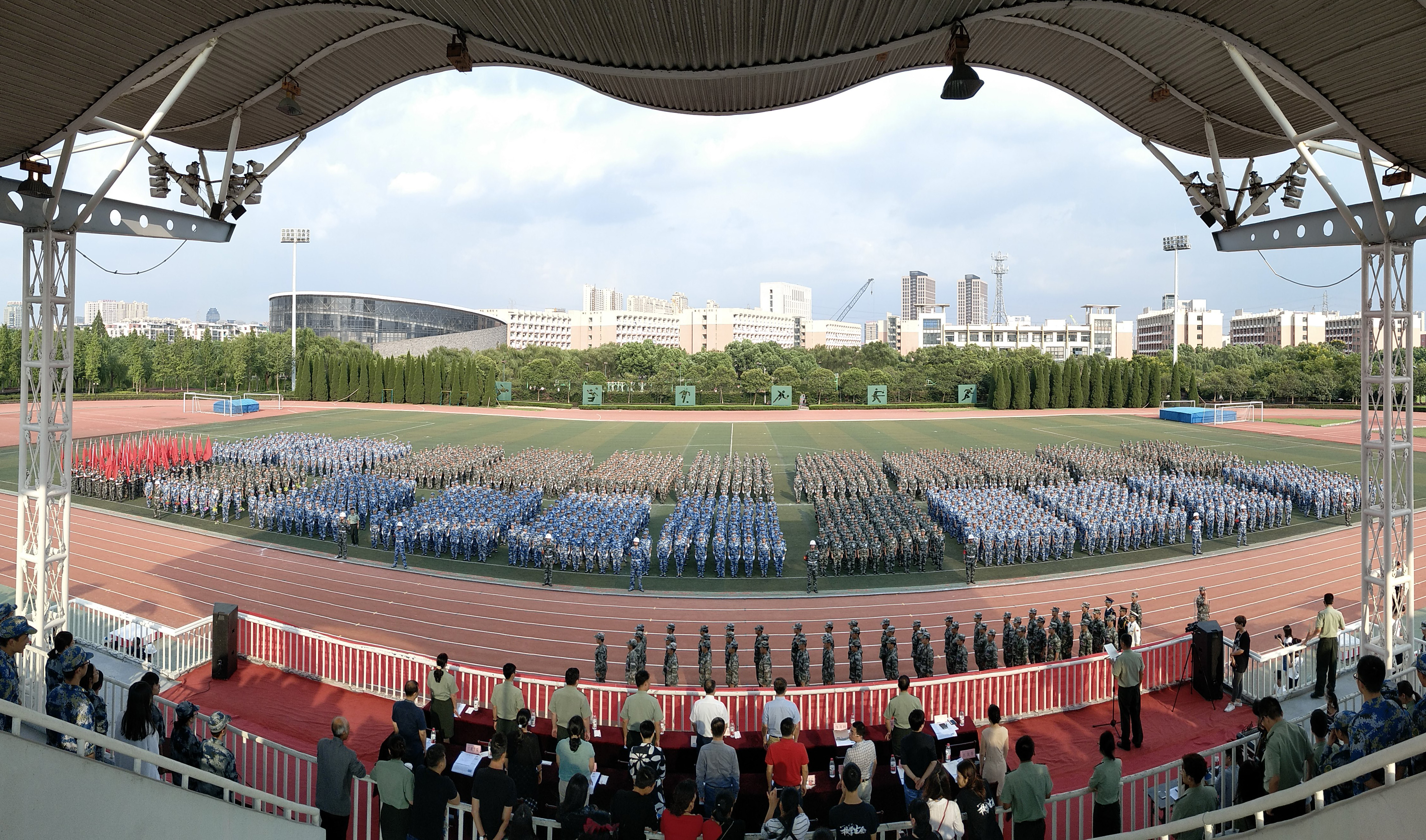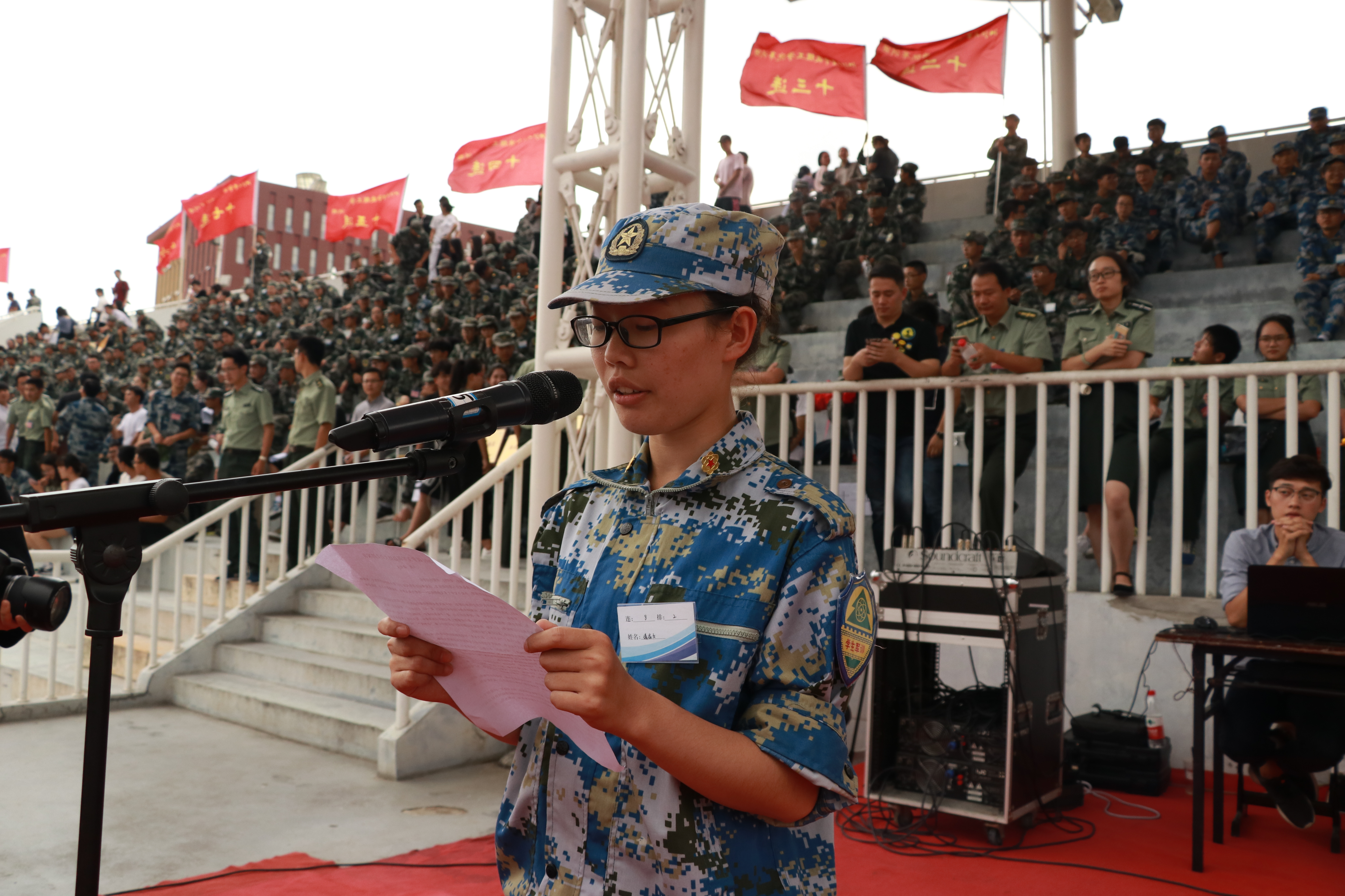 浙大军训师副师长薛东宣读嘉奖令,通报表彰浙江大学宁波理工学院军训团四好连队2个,政治工作优胜连8个,内务卫生优胜连8个,作风纪律优胜连8个,队列优胜连8个,军训综合考评一等奖80人,综合考评二等奖189人。随后,参训学员代表、八连二排诸佳文同学上台发言。
