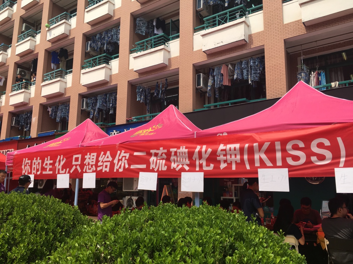 “你的生化,只想给你二硫碘化钾(KISS)”,这无疑是生物与化学工程学院的横幅。“kiss”用化学名称来表达,既有趣又新颖。生化学院主席团的赵宏扬表示:去年的横幅是“Ag Zn I Li”,分别为“银”、“锌”、“碘”、“理”四元素,与“迎新典礼”谐音。这两次的横幅都是想要体现生化学院的独特之处,是学校独一无二的风景。