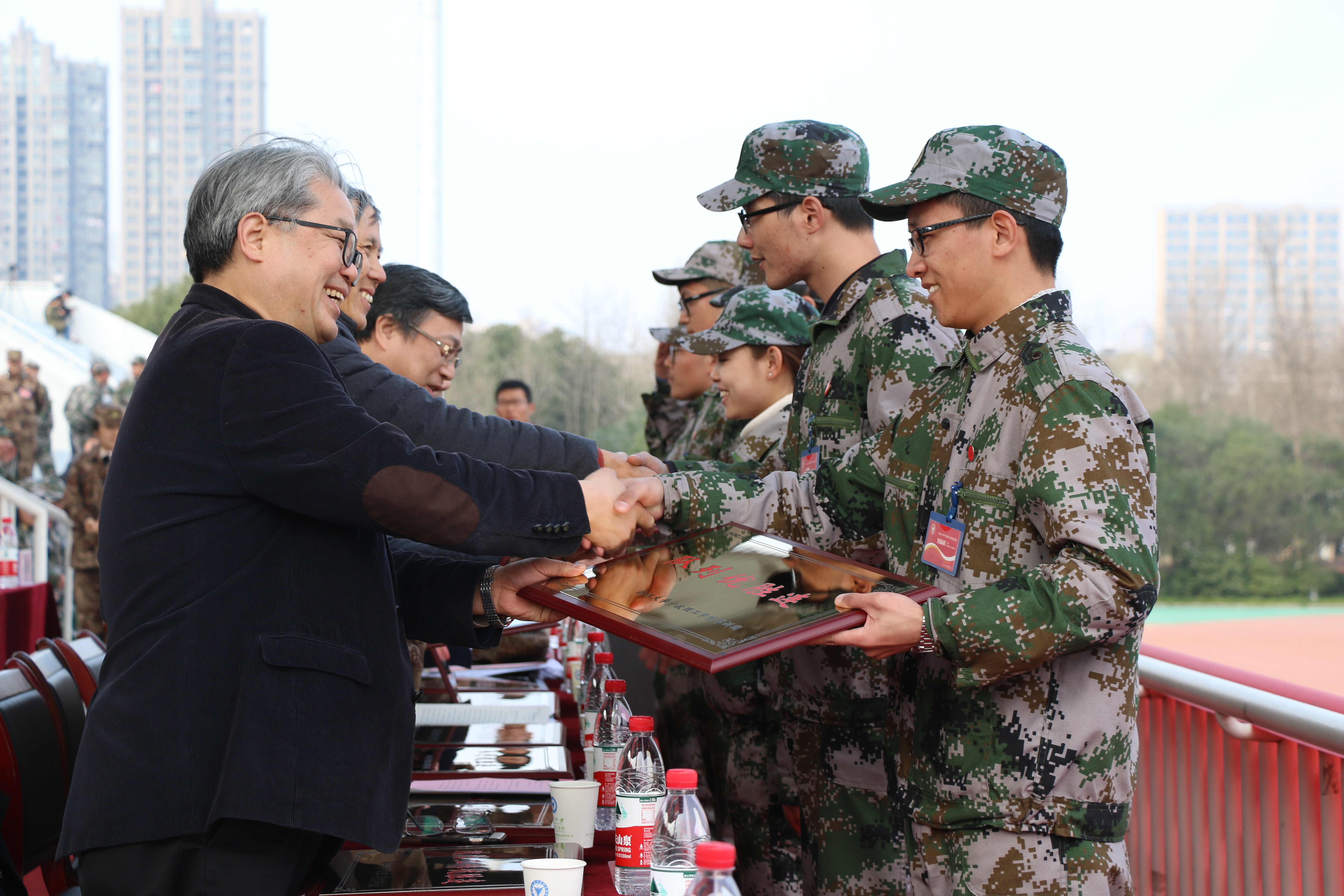 大会最后,学院副院长俞春鸣代表学院向承训部队赠送锦旗。2016级学生军训阅兵暨总结大会圆满结束。