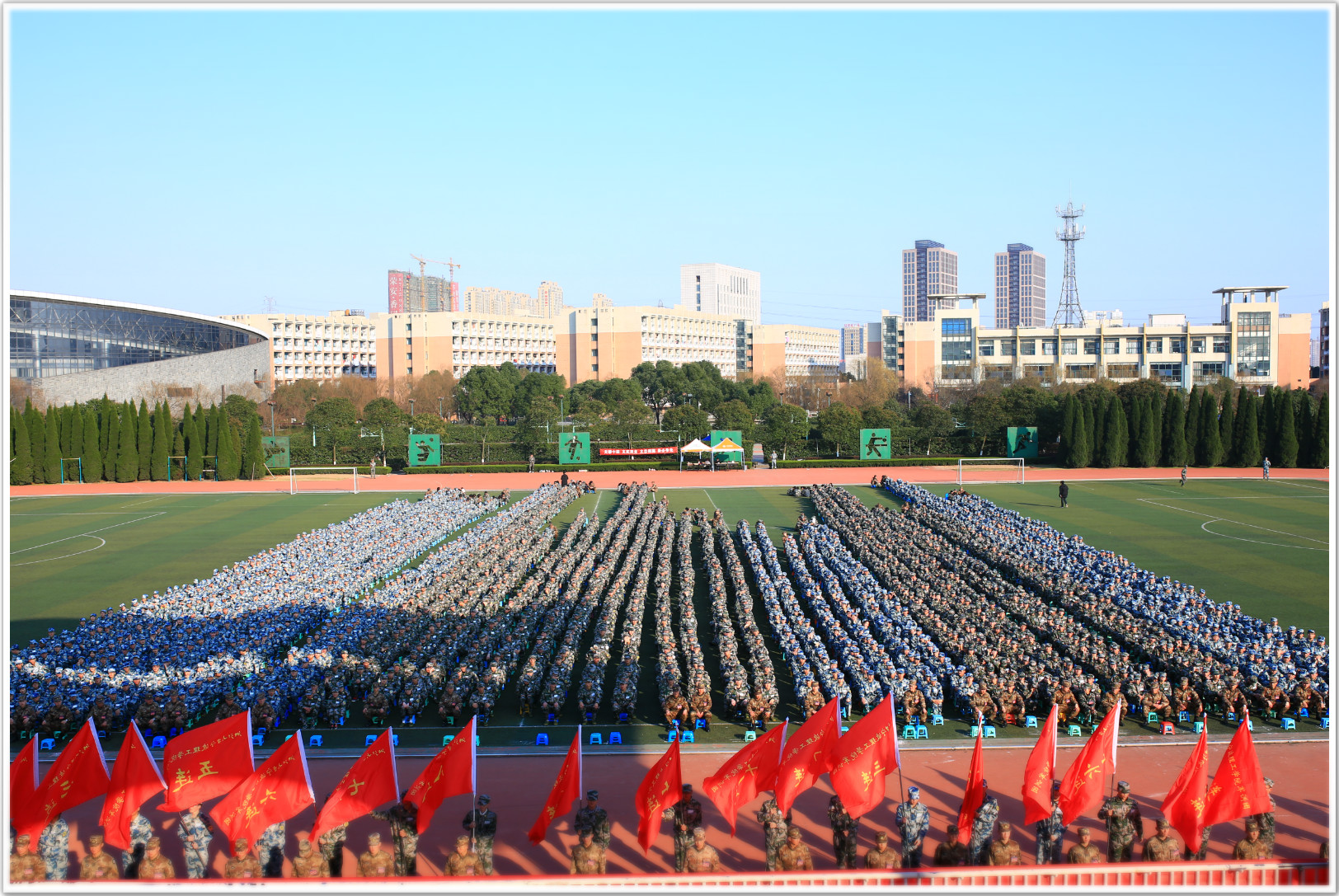 2016级学生军训动员大会在雄壮的《中国人民解放军军歌》中结束,2700余名参训学员斗志昂扬,他们将在未来的12天中迎接挑战、接受考验!