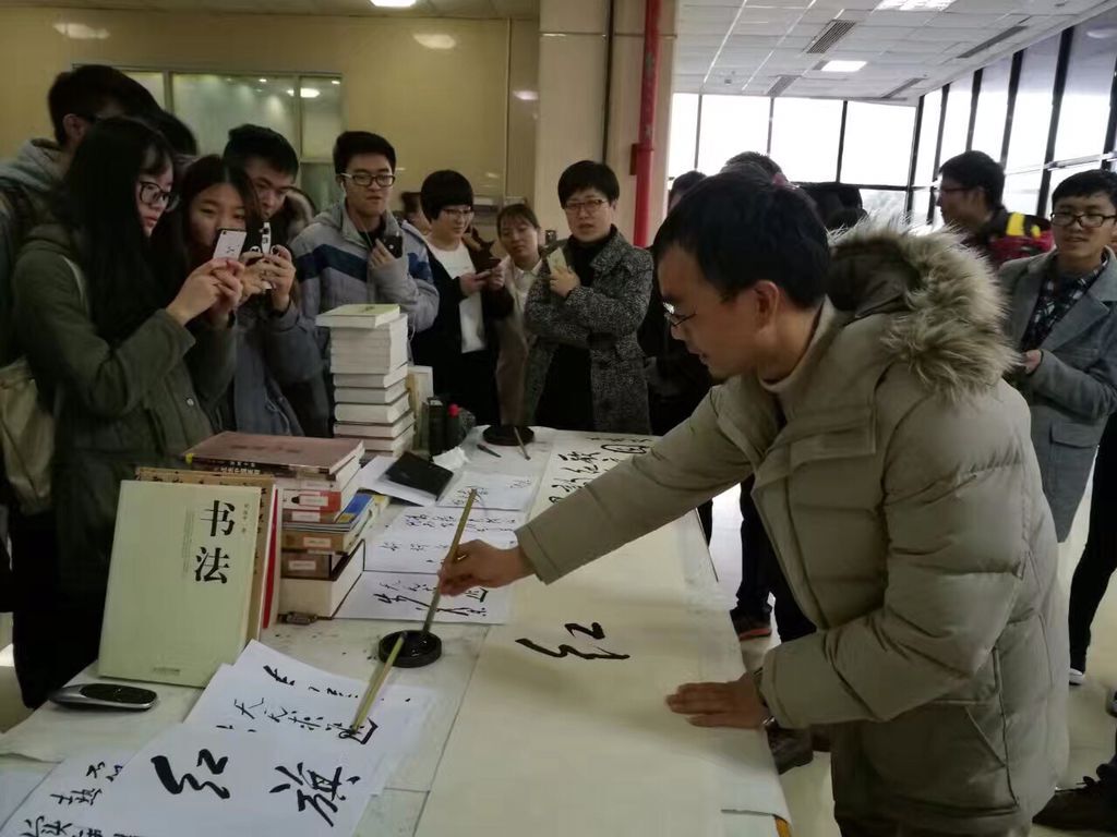 刘杰老师认为:“书法是中国人古老而独特的艺术形式。红色是中国人最热烈喜庆的颜色,代表着中国人对幸福与美好热烈的追求” ,“师生们以灵动的墨韵与炽热的情感,为我们再现了当年革命先辈为国为家的壮怀激烈,一笔一划,饱蘸情思。”现场,商学院的孙健凯同学和谢万尧同学分别朗诵毛主席诗词《忆秦娥·娄山关》、《沁园春·雪》。师生们对书法作品进行参观,并在长卷上现场挥毫泼墨,书写寄语、临摹毛主席墨迹。