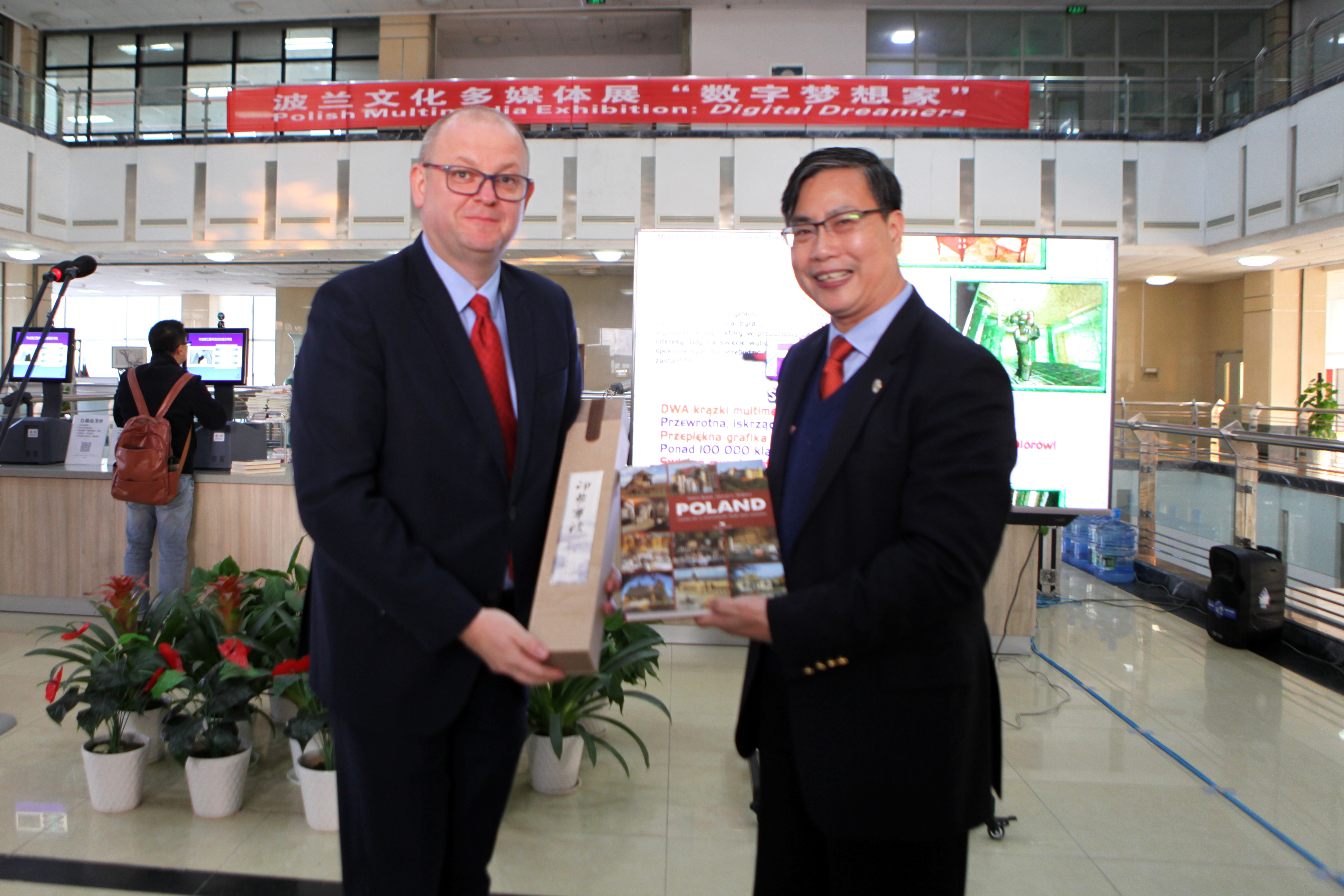 当天下午,各级领导和来宾参观了波兰语言文化中心、“数字梦想家”波兰文化多媒体展和学校办学成果展。杨建刚副院长主持了“数字梦想家”开幕式,金伟良院长与Piotr Nowotniak总领事互赠礼物,表达双方友好合作的诚意。
