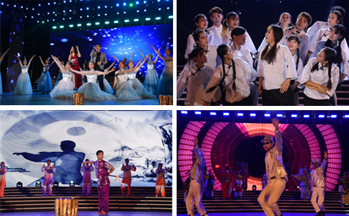 晚会节目精彩纷呈。来自浙江大学教育学院的武术队带来他们的礼物——武术《青年当自强》,表演者们通过自己的动作展现了青年的风华正茂和刚阳之气;由学院教工戏曲社、外国语学院“丹霞清音”戏曲社、UP轮滑社带来的《轮滑遇上Opera》使广大师生眼前一亮,流行的轮滑表演和着悠扬的戏曲,亮闪闪的银色外套穿梭于戏衣;联唱《歌飞校园》结合热门歌曲,唱出校园时光,使台下校友回忆起自己的大学岁月,还有不少学生随之哼唱;宁波大学健美操队和学校八一女篮主场啦啦队配合表演健美操《青春力量》,表演者跟着欢快的音乐甩动全身,充分展现了青春的无限活力......