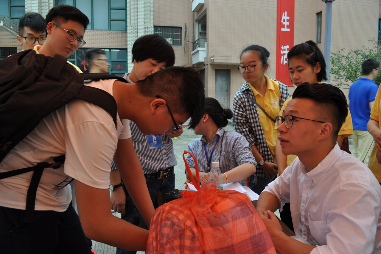一大早,校内迎新的老师和学生志愿者就早早地在校门口、总报到处、各分院报到处等不同地点等待。8点多,新生陆续到来,志愿者们热情接待每一位来到理工的新生,接过行李,迅速带他们完成了注册、上交档案材料、领取寝室钥匙和文化衫等流程。最后带他们入住宿舍,途中不时热情地向新生介绍学校情况。