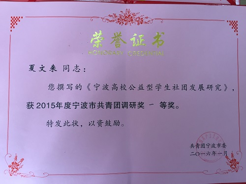近日,宁波团市委发文表彰在2015年度共青团工作中表现优秀的各类先进,我校共青团全面开花,获得2015年度宁波市先进团组织、宁波市共青团调研工作优秀组织奖和宁波市共青团宣传工作先进集体等多项殊荣,团刊《随园青年》被评为宁波市优秀团刊。此外,经贸学院团委、机能学院团委、管理学院团委被评为宁波市先进团组织,李敏等四位老师被评为宁波市优秀团干部,吴映江等5名同学被评为宁波市优秀团员,由夏文来老师撰写的调研报告《宁波高校公益型学生社团发展研究》获得宁波市共青团调研一等奖,由应中元老师、黄少华老师合作完成的调研报告《高校学生组织网络新媒体平台的管理和引导》获得二等奖,由伍醒老师、仇芳老师、毛红淳同学、张成同学完成的《弘扬抗战精神,树立党团新风—宁波市区抗日时期红色遗迹保护利用情况调研报告》获得调研三等奖。
