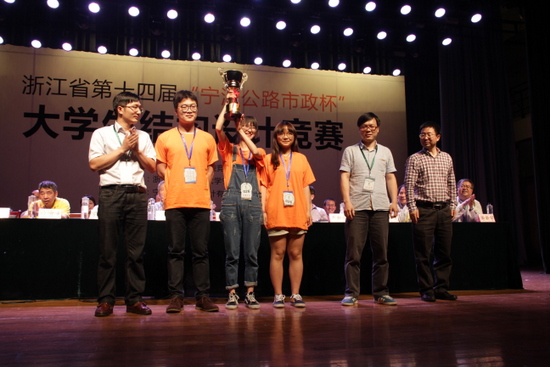 经过紧张激烈的竞争,本科和专科组冠军分别由我校和湖州职业技术学院获得,经专家组投票,被授予特等奖。我校将作为浙江省本科院校代表参加今年10月于昆明理工大学举办的2015年全国大学生结构设计竞赛。另外,本次大赛还评出了63支队伍获奖,专科组分别有3支、8支和10支队伍获得一、二、三等奖,本科组分别有7支、14支和21支队伍获得一、二、三等奖,其中各有2支队伍还获得“最佳创意奖”和“最佳制作奖”。