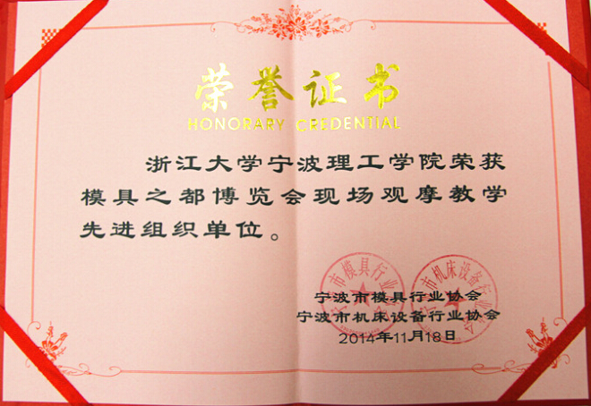 2014第十届中国模具之都博览会于今年5月21--24日在宁波国展中心举行,集聚了当今一流的机床、模具、测量仪器以及气动液压等产品及新技术、新工艺。我校机能学院分层次组织学生参加并进行了现场观摩教学,组织研究生参加了3D打印与成型技术论坛,组织2014级机制专业本科生进行了展会现场观摩教学,并在参观后完成了一份报告。近日,主办方授予了我校“先进组织单位”荣誉称号,充分肯定了我校参与现场观摩教学活动组织得当、成效突出。